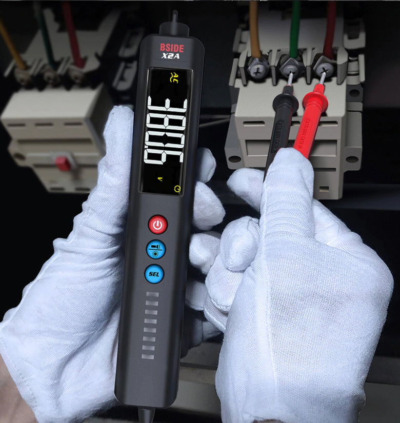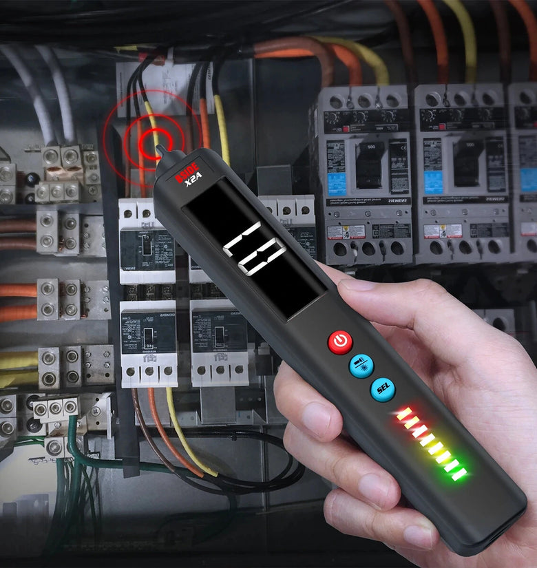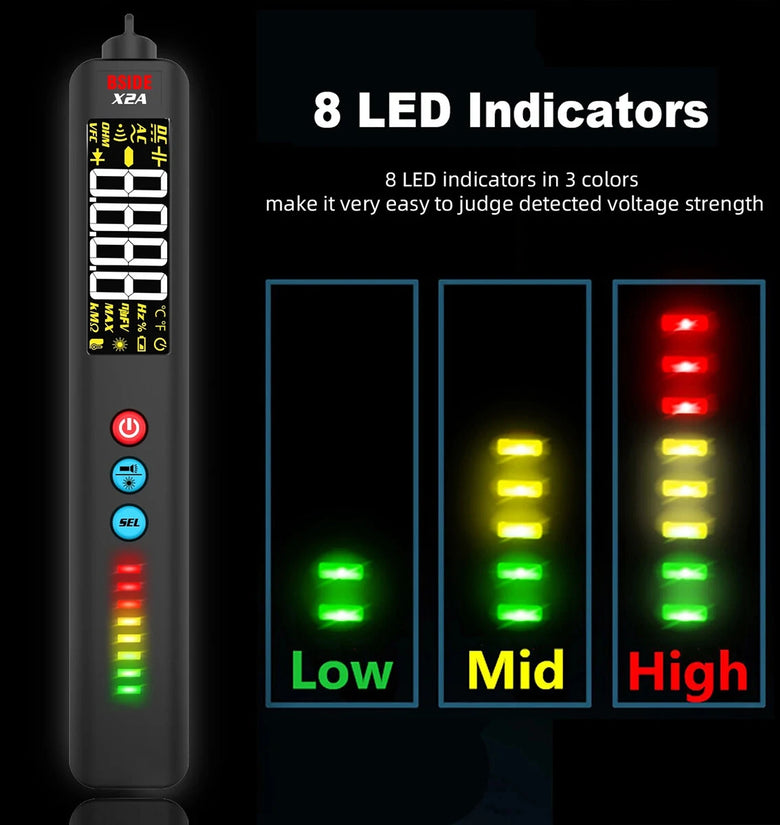 8 LED indicators in 3 colors make it easy to judge detected voltage strength. Sound, indicator and screen triple-alarm function makes the measuring safer.