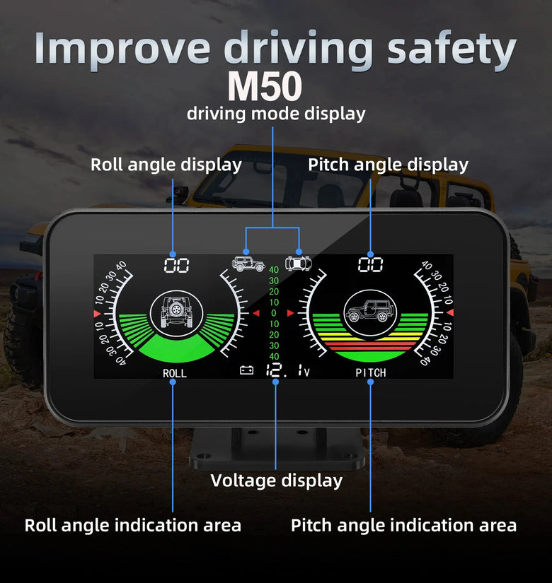 -- Real-time measurement of the vehicle roll and pitch angle during driving, the range is -40°~ +40°.