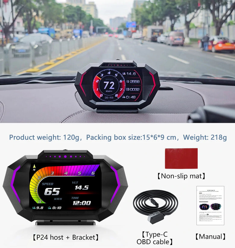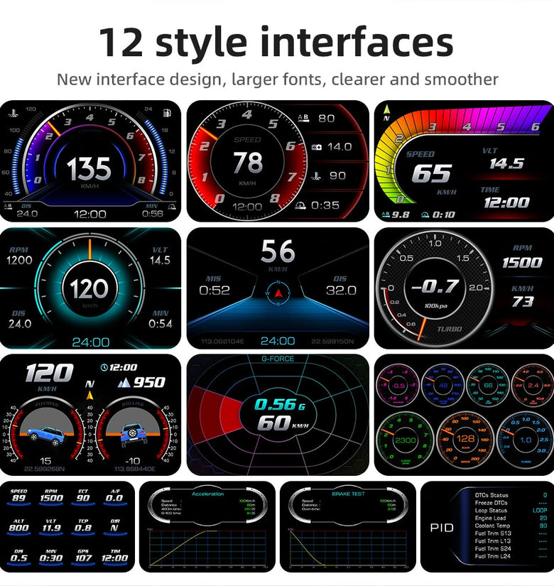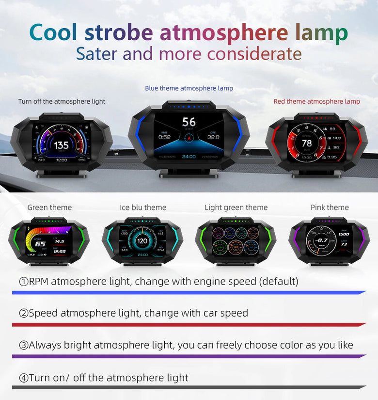 OBD+GPS+inclinometer+ambience light (blue/red/purple switching)+12 language settings (English/Chinese Simplified/Chinese Traditional/Thai/Japanese/Korean/Russian/Arabic/Malaysian/Spanish German French) +12 squares+newly added speed meter G value table.