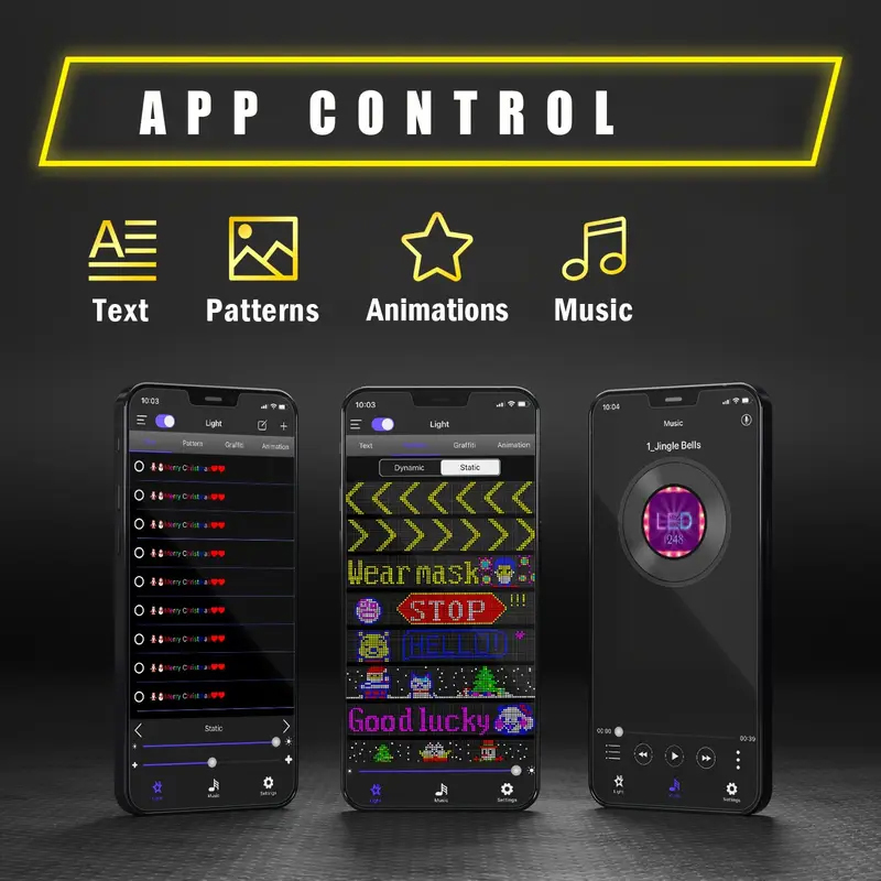 - Bluetooth and App Control: Easily manage and customize your display using Bluetooth connectivity with our dedicated app. Whether it's text, dynamic pictures, static images, or music rhythms, you can adjust brightness levels, alter scrolling directions, and schedule speeds for ultimate personalized experiences.