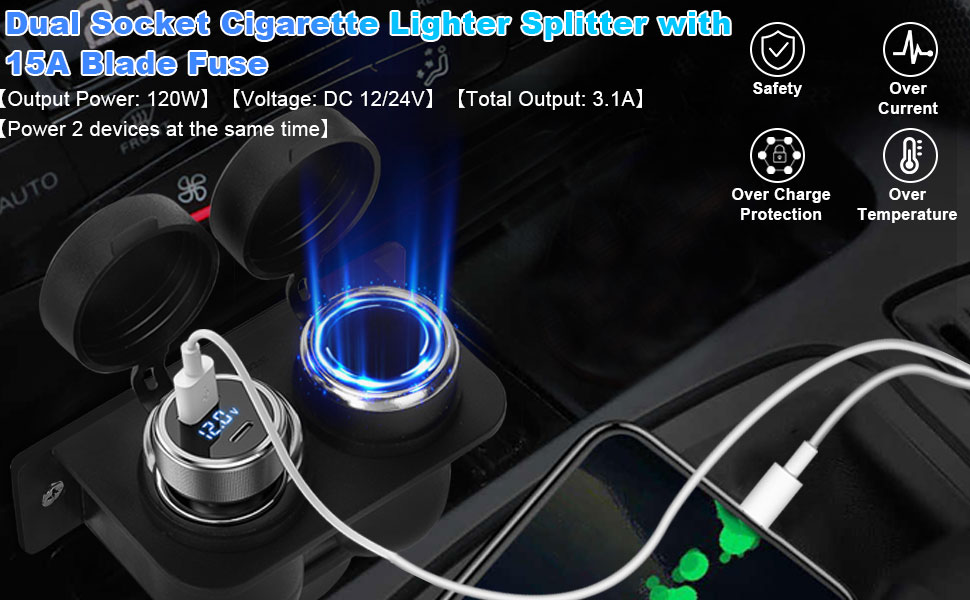 - Dual Socket Capability: Designed with 2 female sockets, this lighter socket can simultaneously power multiple devices. The total output is 3.1A with an output power of 120W, making it ideal for various 12-24V vehicle equipment, such as GPS, dash cams, vacuum cleaners, car fridges, heated seats, and navigation systems.