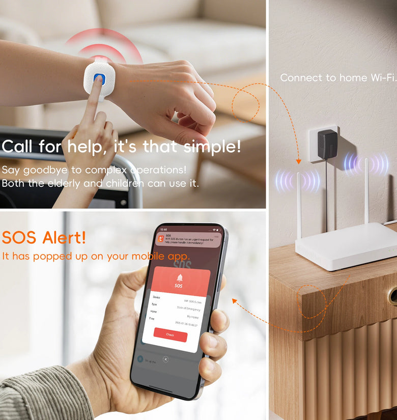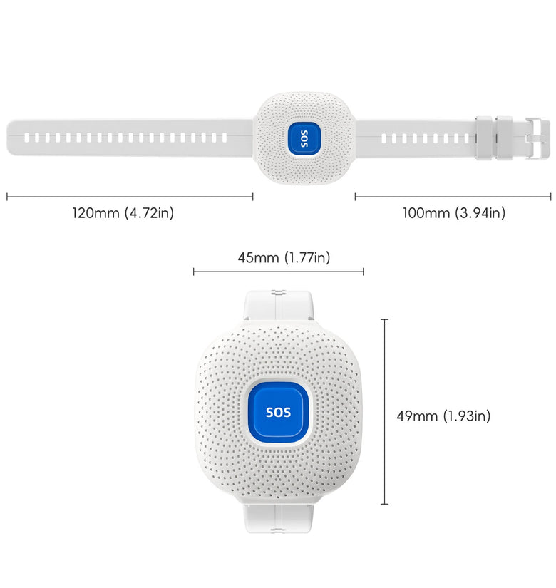 1. One-Touch SOS: Press the blue button to instantly alert pre-set emergency contacts via mobile notifications.