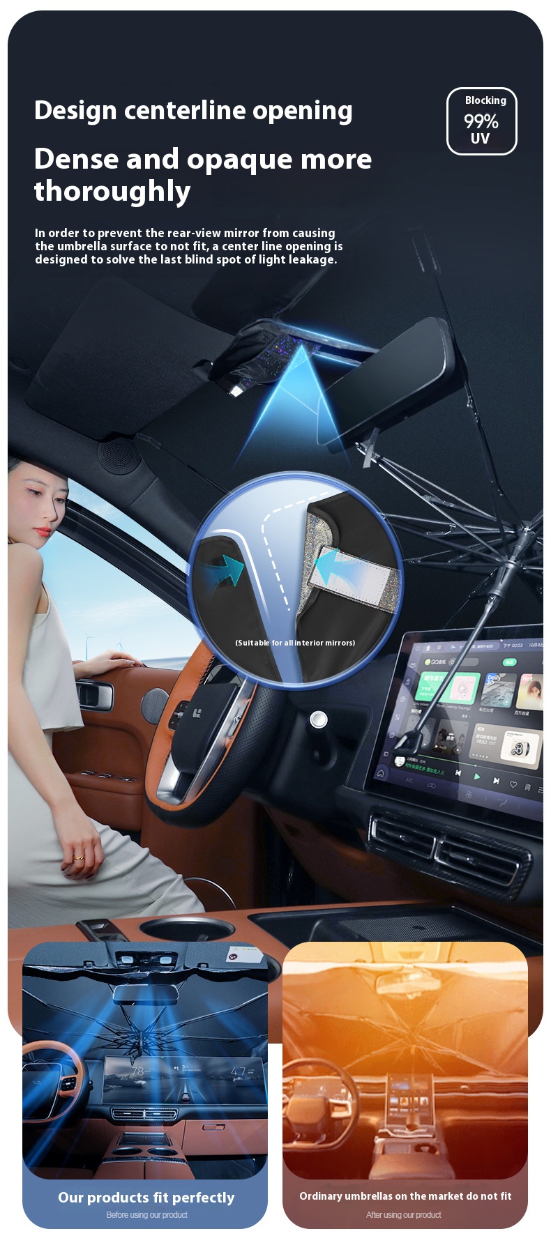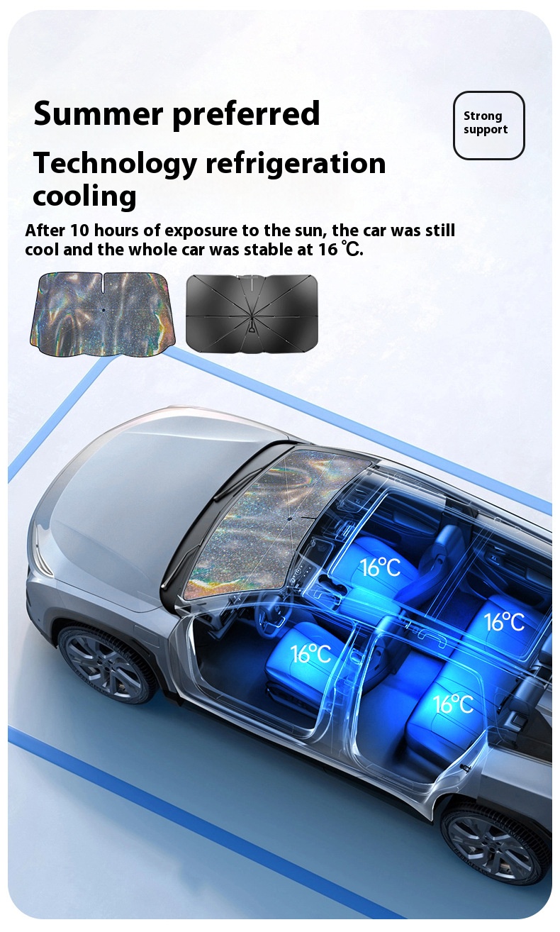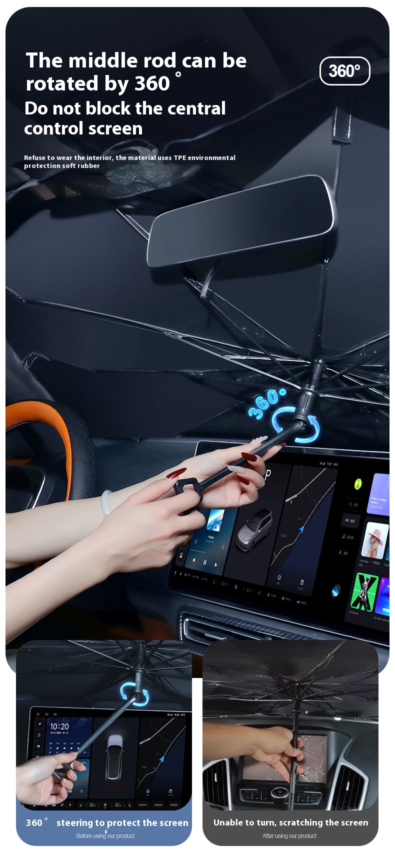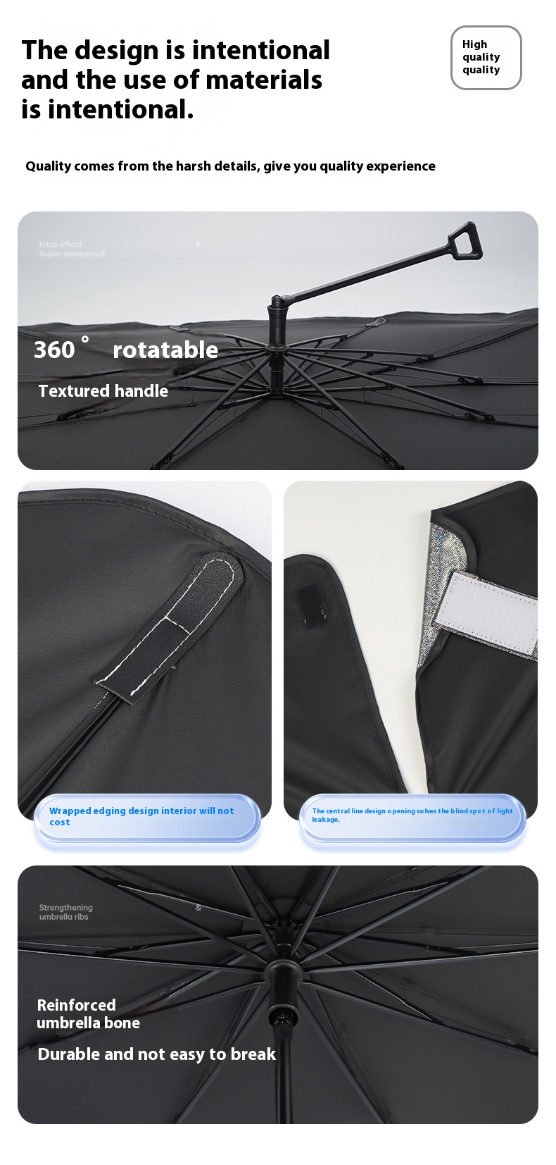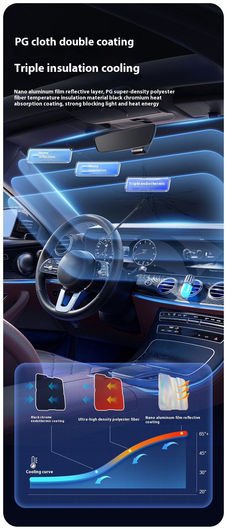 1. Superior Heat Reduction: Utilizing advanced materials such as aluminum reflective coating and high-density polymer fibers, this sunshade umbrella efficiently lowers the interior temperature by up to 20°C, ensuring a cool and comfortable driving environment.