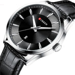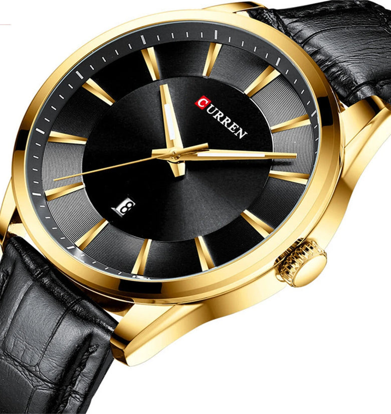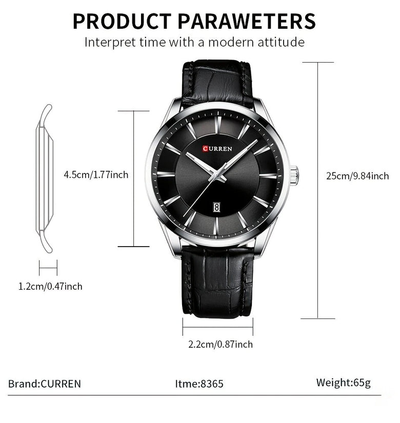 1.45mm Case Diameter: The 45mm case diameter makes a statement, perfect for those who prefer a larger, more eye-catching watch face.2. Leather Strap and Buckle: This CURREN watch comes with a premium leather strap and a safety buckle, which is long-lasting and comfortable to wear.3. Top Men's Watches | Fossil Original Watches | Luxury Brand Business Style: CURREN quartz watches blend luxury with business elegance to enhance your professional image.4. Waterproof Depth: 3Bar, this CURREN watch is waterproof up to 3Bar, allowing you to confidently engage in daily activities.5. Quartz Movement: CURREN watches use precise quartz movements, which are reliable and ensure accurate time every moment.