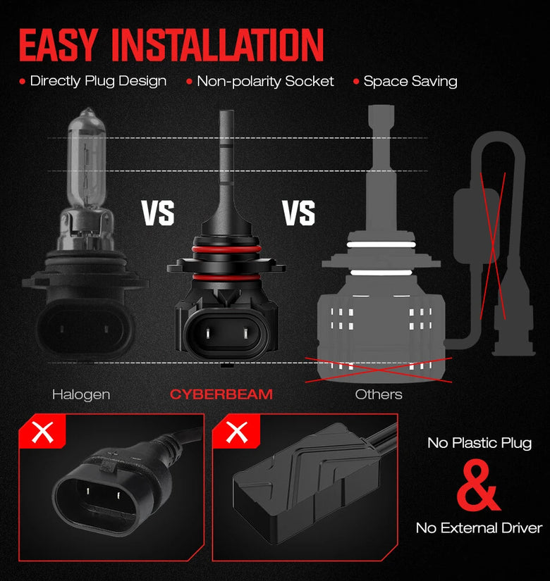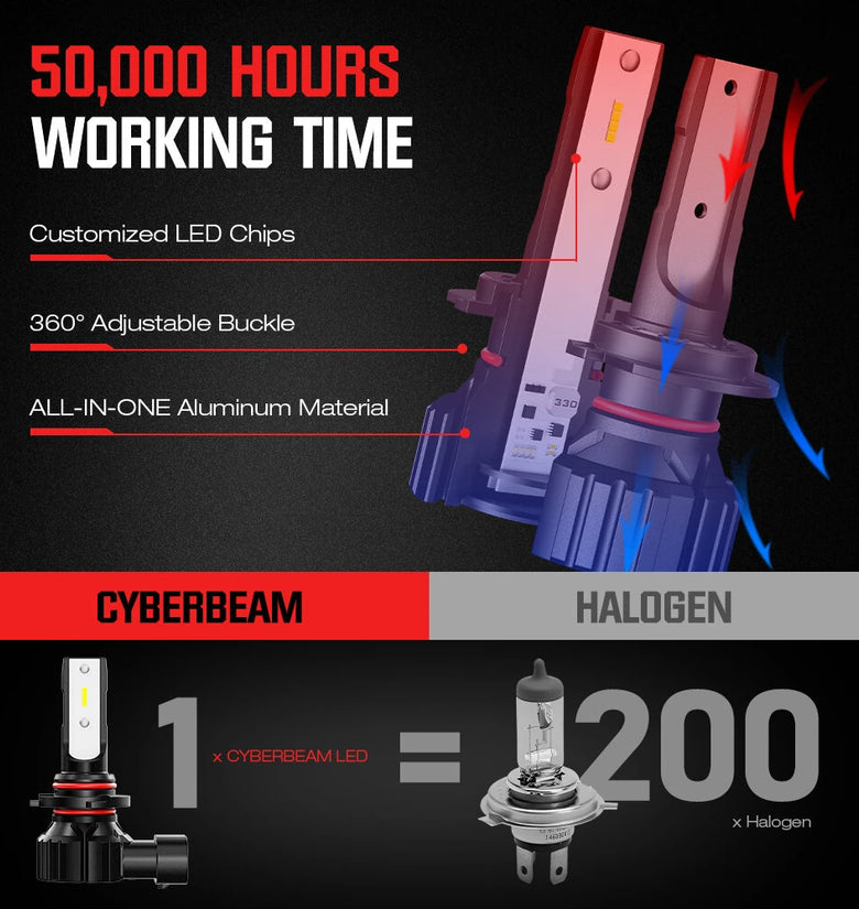 - Advanced Chip Technology: Featuring CYBERBEAM’s latest chip technology, these headlights utilize the same filament length as halogen bulbs to maintain the same focal length, providing focused and intense illumination without any glare or dark spots.
