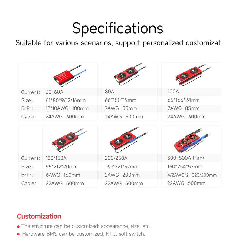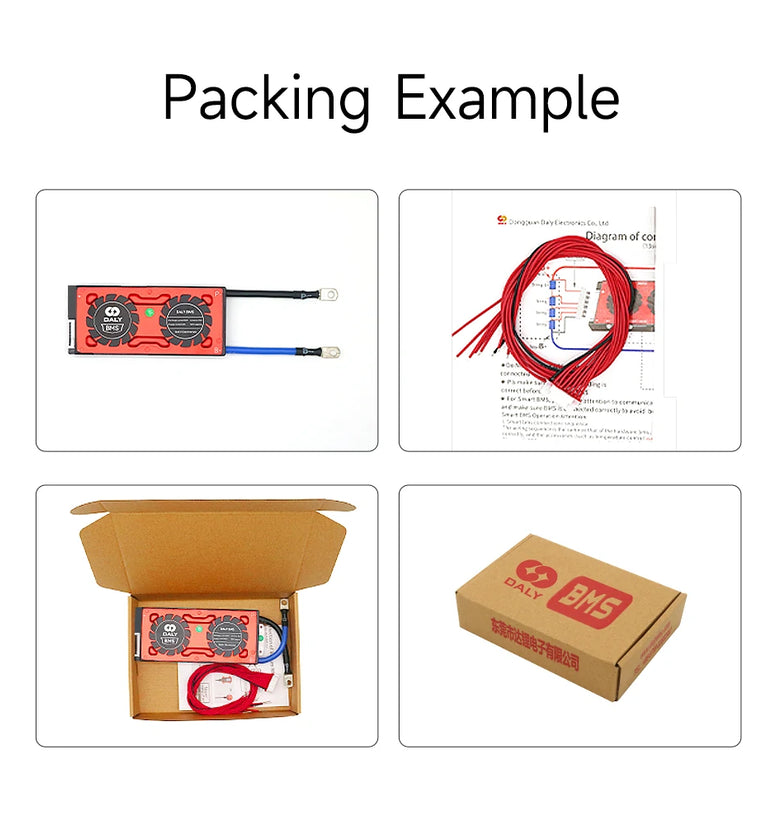 Protective board connection battery wiring:* Special attention: The wire cable of different manufacturers are not same standard, please make sure to use he matching cables; the colors of B- and P- lines of different manufacturers are different, please pay attention to the B- and P- marks.1. Remember!!! When welding sampling wire cable, do not insert the cable into the BMS.2. The cable connects the total negative electrode B-from the fine black line. The second wire (red wire) is connected to the positive pole of the first string of batteries.Connect the positive electrode of each string of batteries in turn until the last wire cable of the total positive B+.3. After the cable is connected, do not insert the plug directly into the BMS.First measure the voltage between each two adjacent metal terminals on the back of the plug. If it is a ternary lithium battery, the voltage should be between 3.0~4.15V, and the iron-lithium battery should be 2.5~ Between 3.6V, lithium titanate battery should be between 1.8-2.8V, make sure the voltage is correct before proceeding to the next step.4. Receive the BMS B-line (blue thick line) to the total battery negative electro-de (B-line length should not exceed 40cm).5. Insert the wire cable into the BMS.After the wiring is completed:1. Measure whether the voltage of battery B+, B- is equal to the voltage of B+ and P- (that is, whether the voltage of the battery pack itself is e- qual to the voltage after passing through the protection board, if they are equal, the BMS is working normally, which can be used normally. If not, please follow Re-check the queue of the wiring above.2. The positive electrodes of the charging and discharging end are all directly connected to the total positive pole B+ of the battery; the wiring method of the same port BMS is that the charging and discharging negative poles are connected to the P- point of the BMS; the wiring m- ethod of the branch BMS is the negative pole of charging Connected to C-, the negative electrode of discharge is connected to P-.3. Finally, if you have any questions, please contact the customer service to help you solve it.