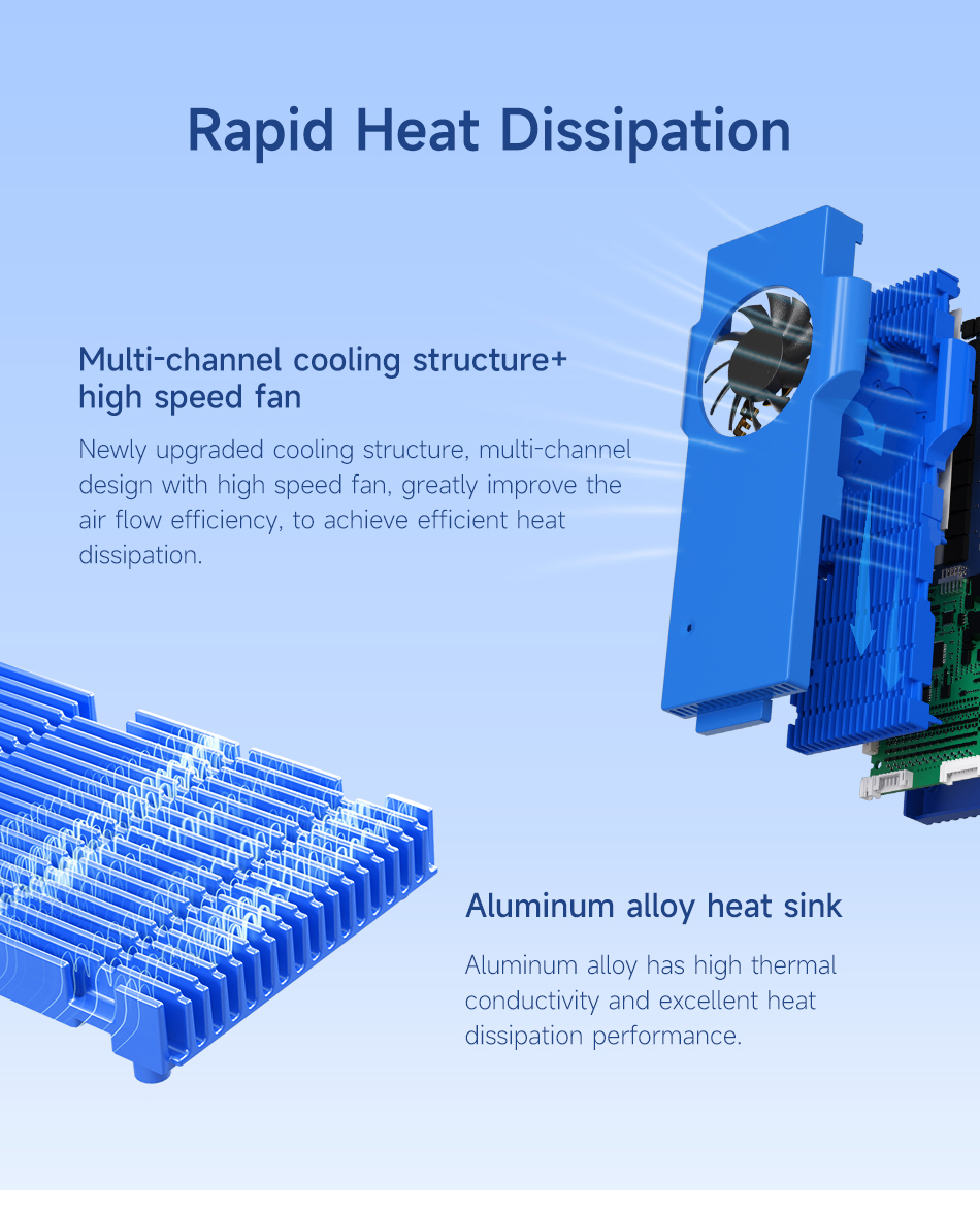 Includes a multi-channel cooling structure and high-speed fan for efficient heat dissipation.