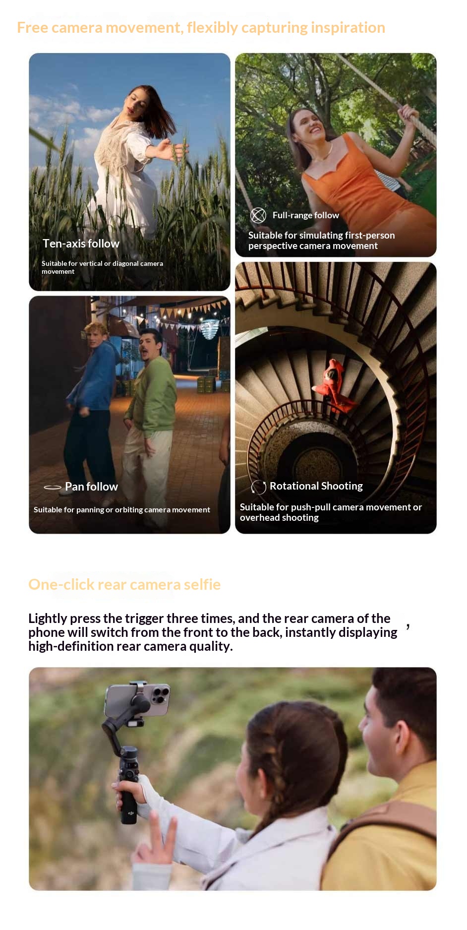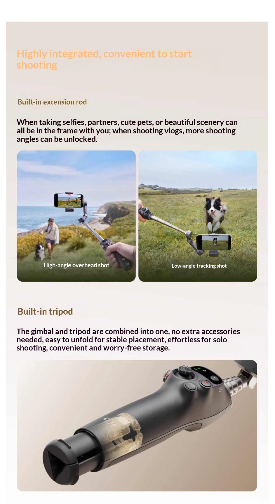 3. Built-in Tripod and Extension Rod: Integrated design enables flexible shooting angles from low to high perspectives.