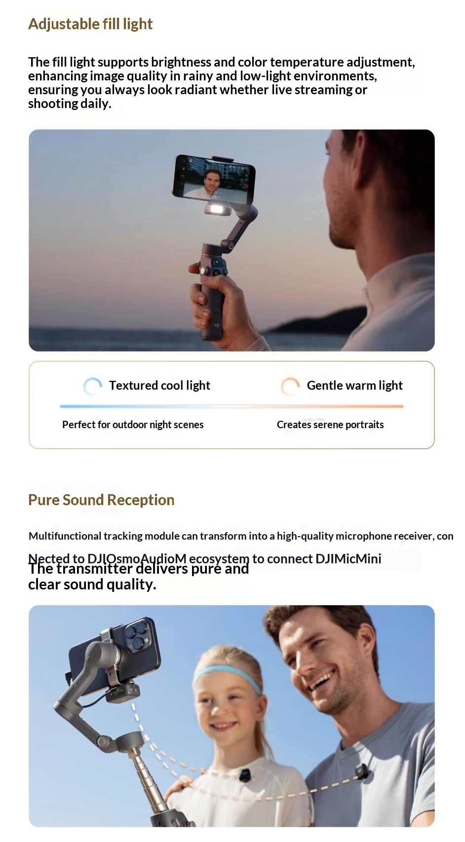 4. Adjustable Fill Light: Brightness and color temperature controls suitable for various lighting conditions, enhancing video quality.