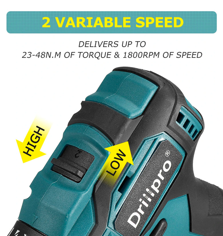 - 2 variable speed settings for smooth screwing at low speed and rapid drilling at hight speed.