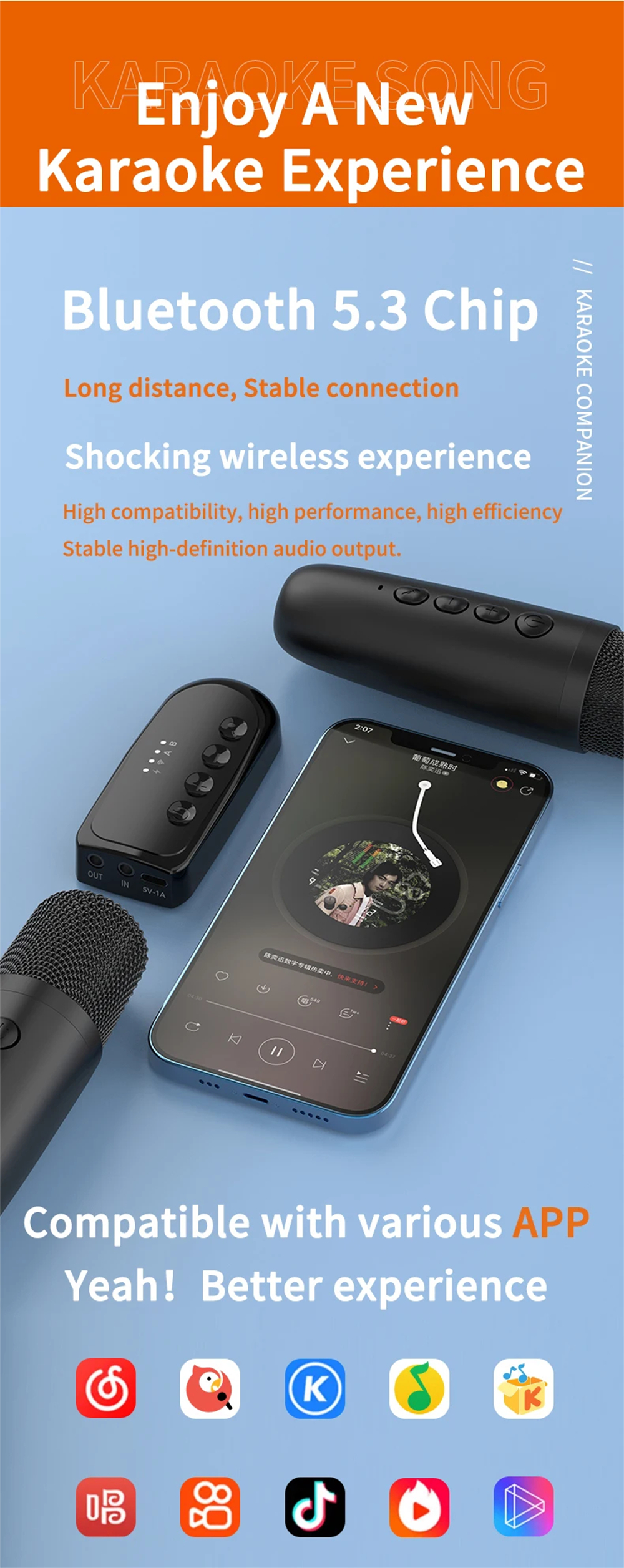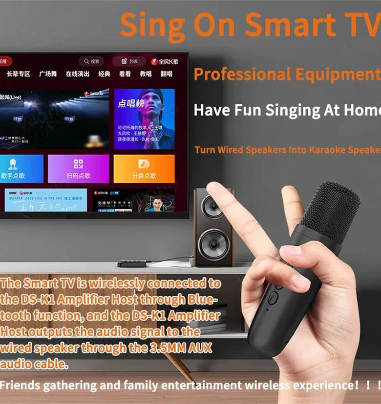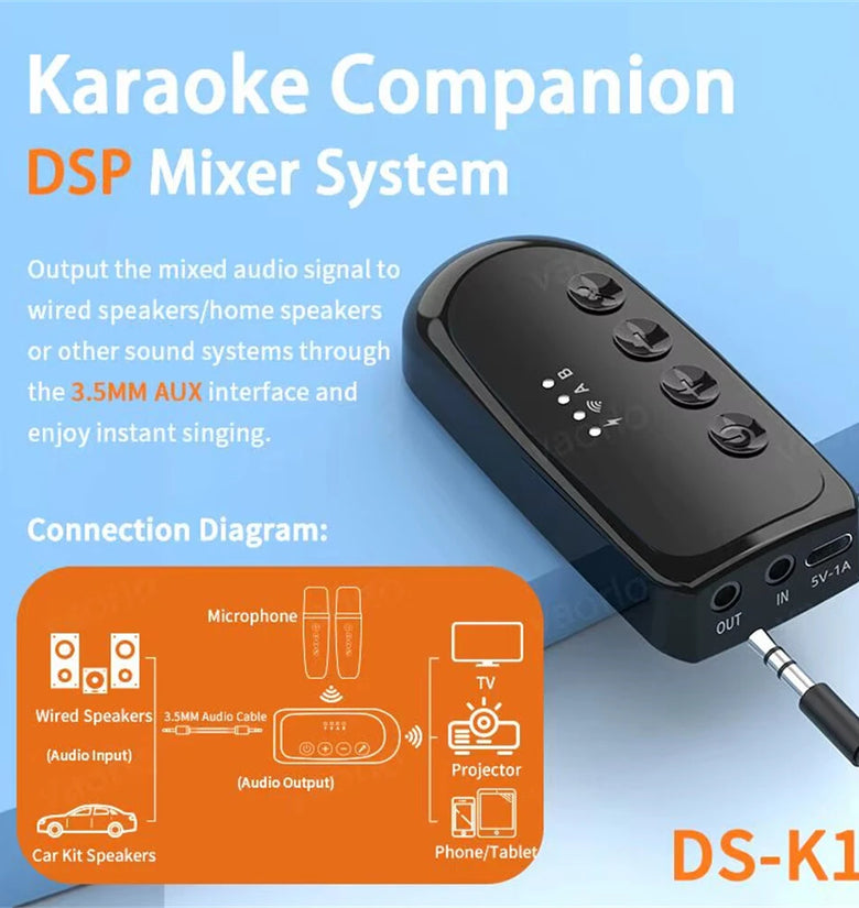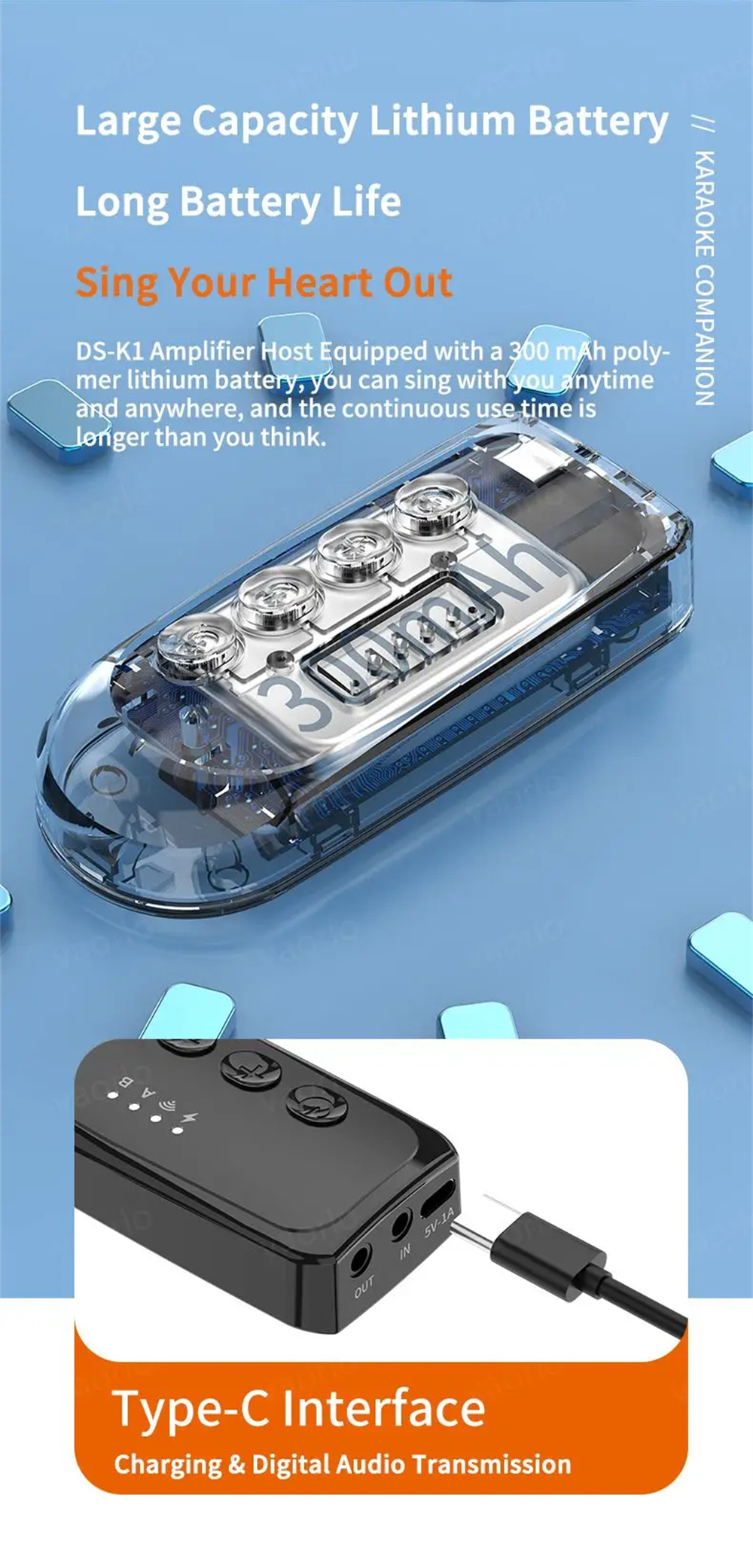 Feature:1. DS-K1 Karaoke Companion adopts the latest Bluetooth 5.3 technology and Karaoke Mixer System, which can upgrade traditional wired speakers to wireless karaoke speakers. It has a built-in DSP-level sound card to beautify the sound effects and intelligently improve the sound quality, so that you can sing a good voice and and make your voice more realistic and beautiful.