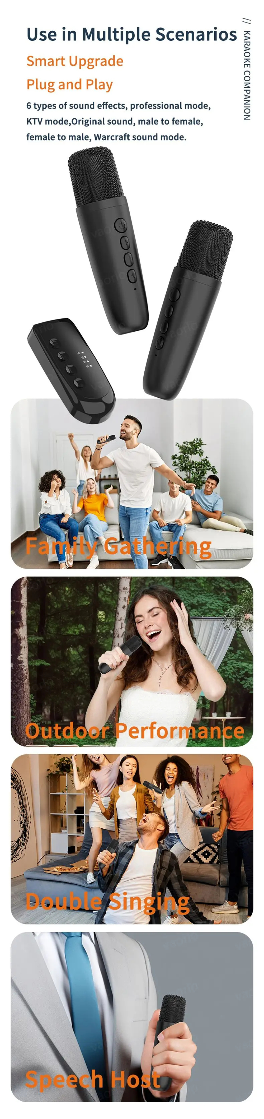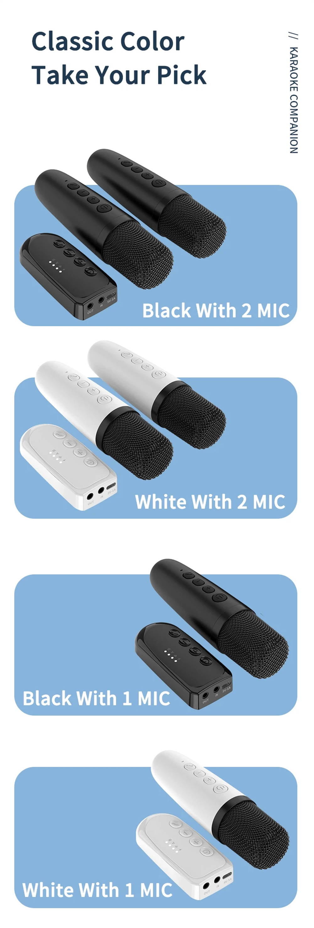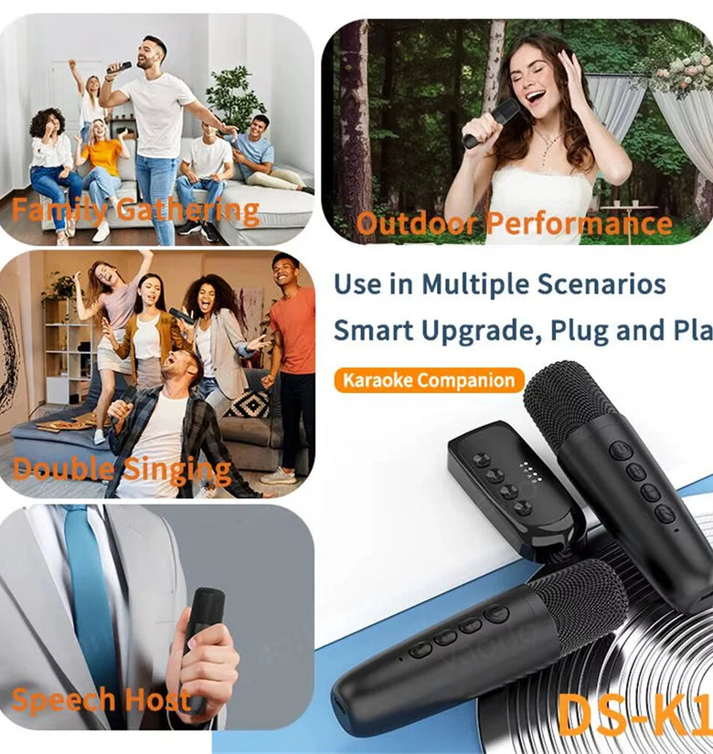 Feature:1. DS-K1 Karaoke Companion adopts the latest Bluetooth 5.3 technology and Karaoke Mixer System, which can upgrade traditional wired speakers to wireless karaoke speakers. It has a built-in DSP-level sound card to beautify the sound effects and intelligently improve the sound quality, so that you can sing a good voice and and make your voice more realistic and beautiful.