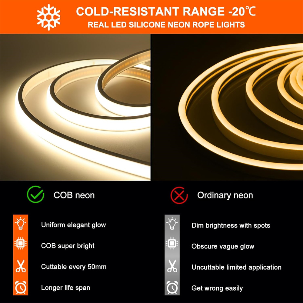 • Elfeland 1m/2m/5m COB LED Strip Light IP65 Waterproof Flexible 288LEDs/m Warm White 3000K/Natural White 4000K High Brightness Indoor Outdoor Use