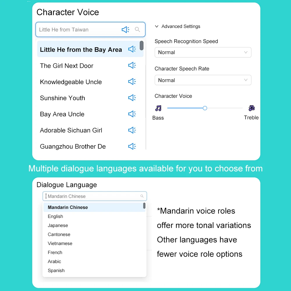 Custom Settings: Character tones, languages, personalization of conversational personality