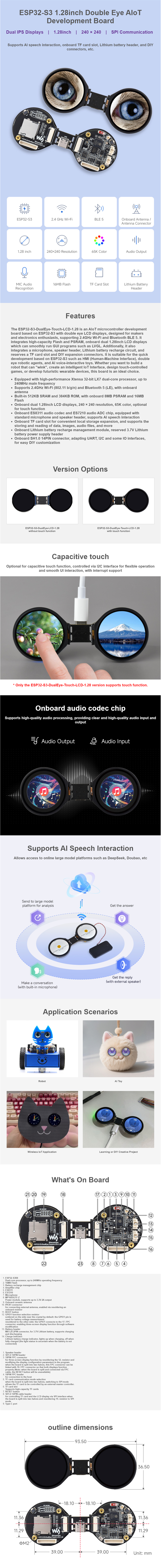 • ESP32 S3 DualEye LCD Development Board Dual 1.28 Inch IPS Screen 240x240 WiFi Bluetooth AI Voice Smart IoT Interface