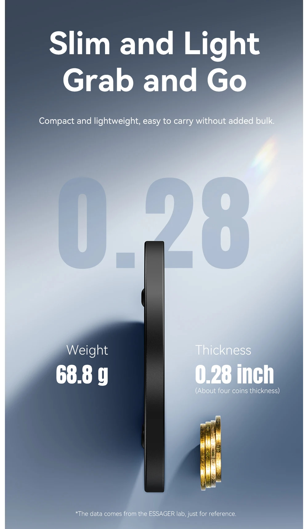 5. Compact & Lightweight Design: Slim profile with 0.28-inch thickness and weighs only 68.8g for easy portability.