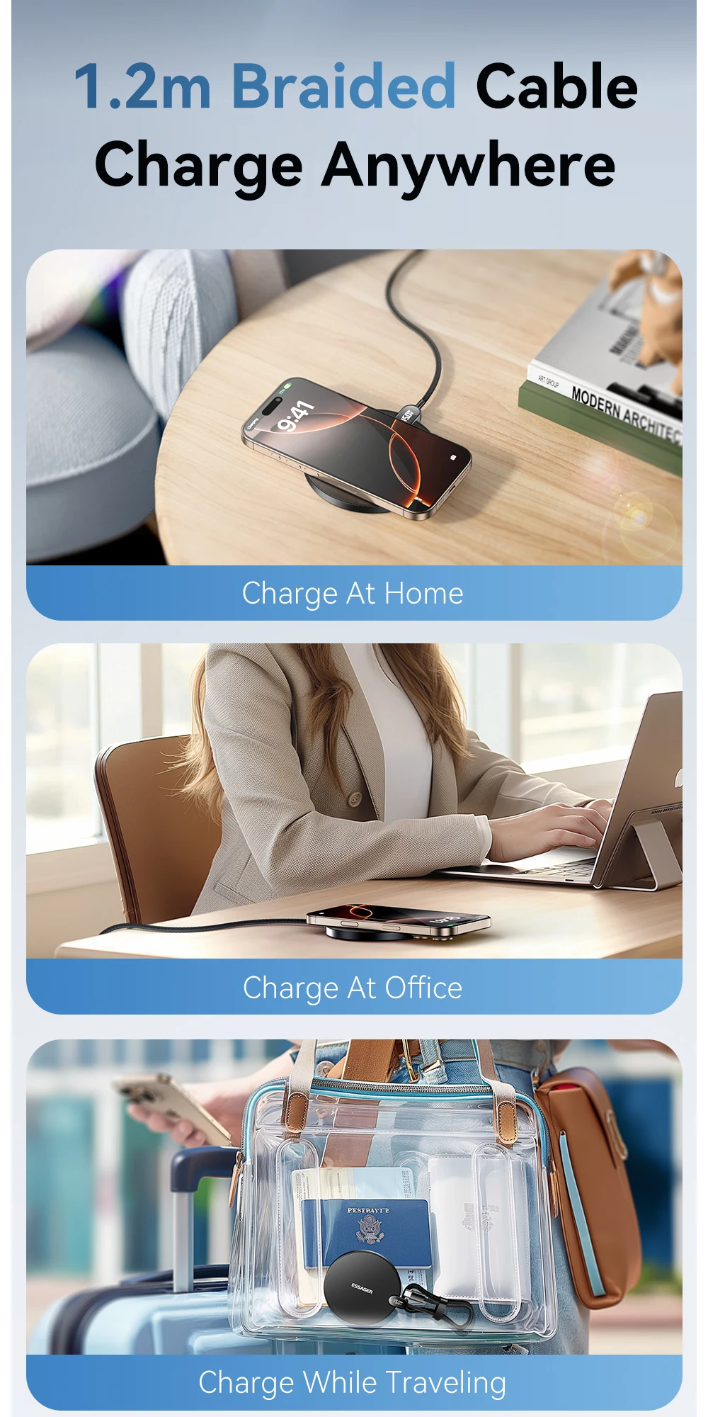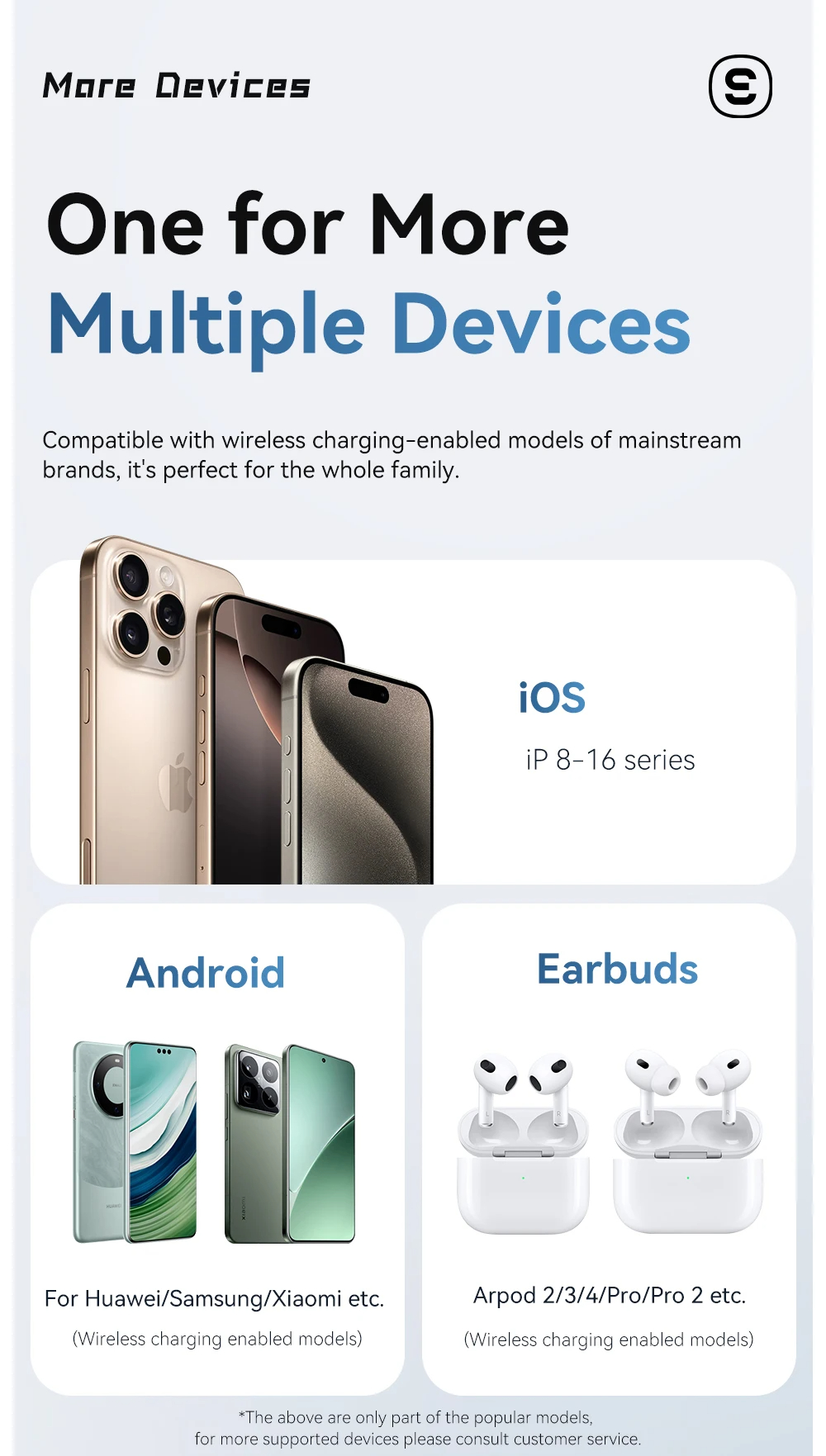 6. Universal Compatibility: Supports various device types including smartphones (iOS and Android) and wireless charging-enabled earbuds.