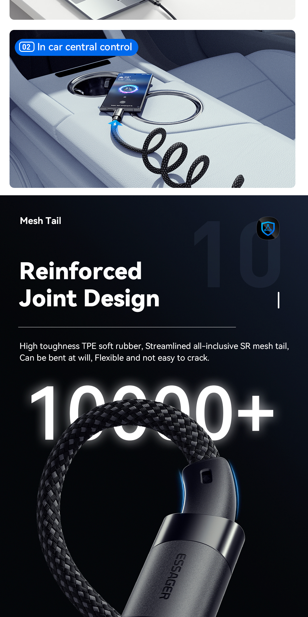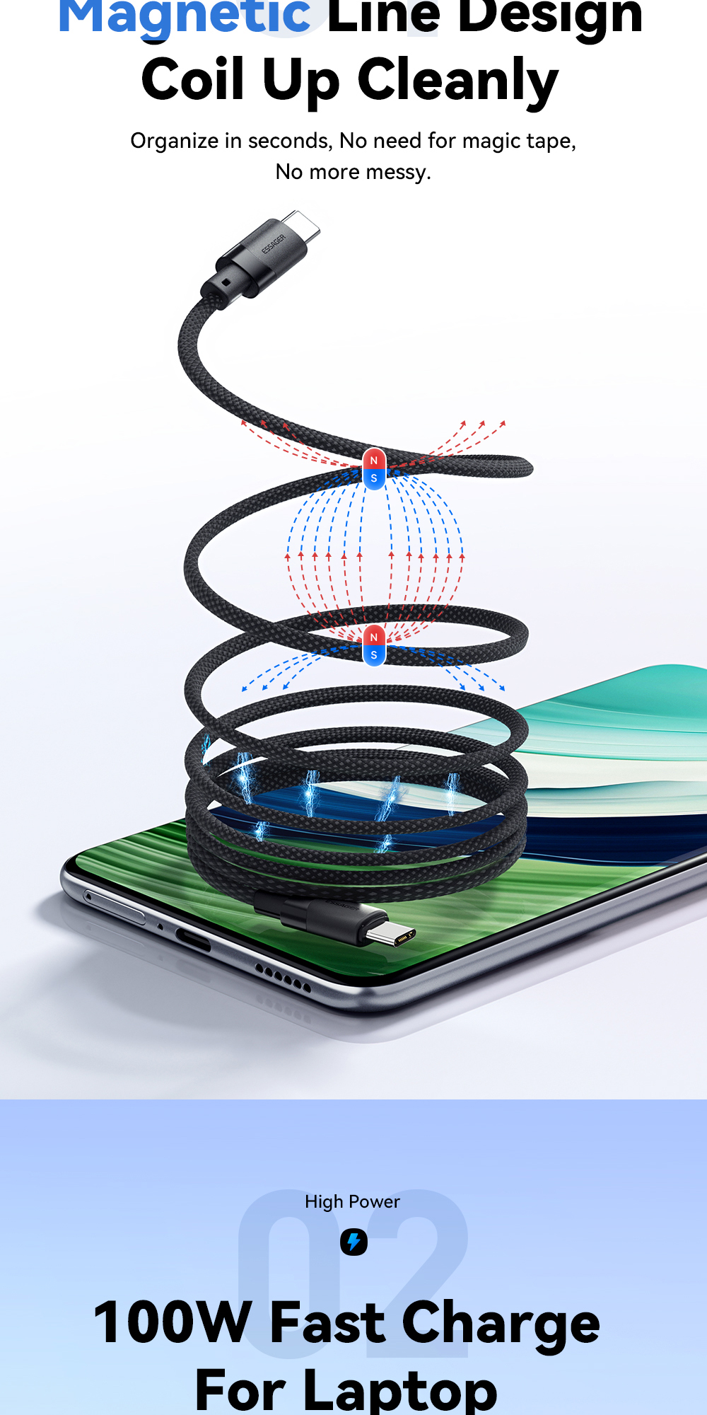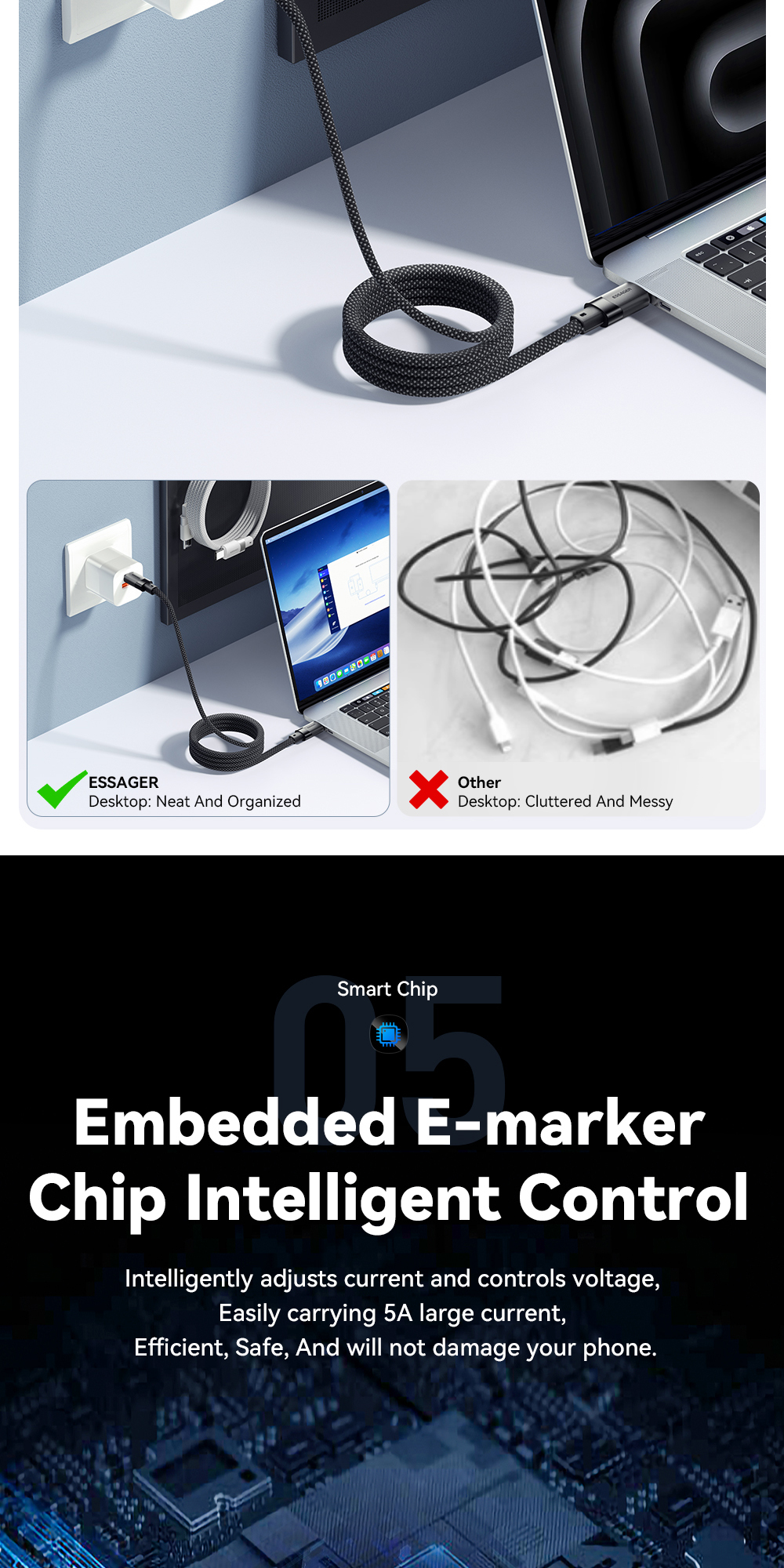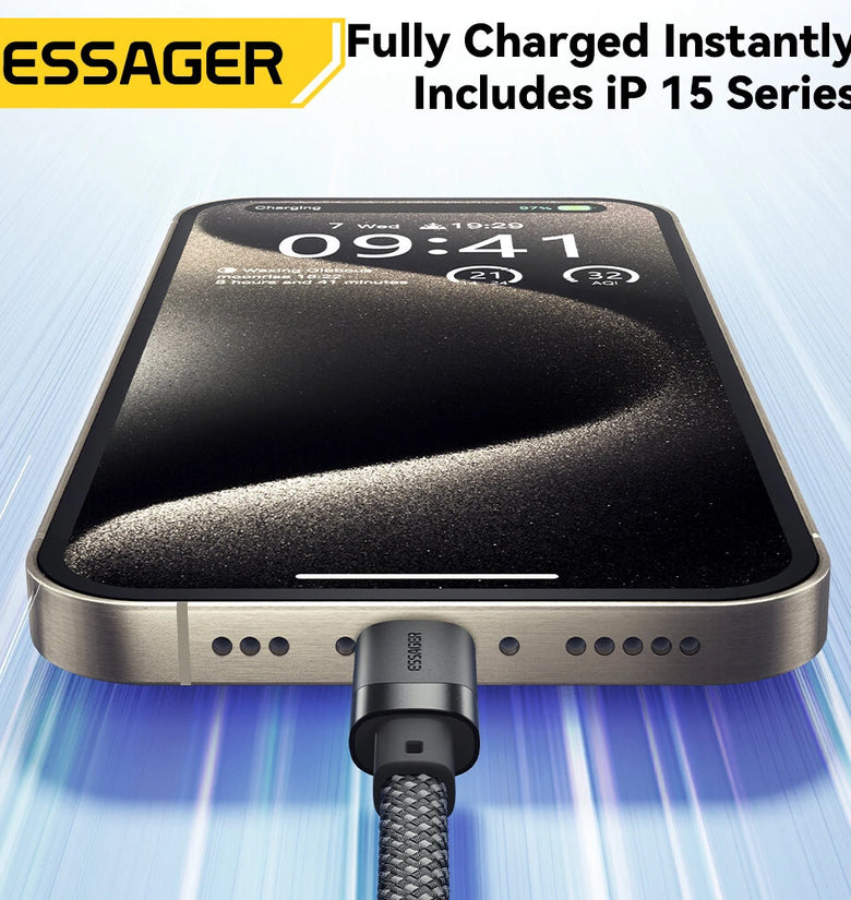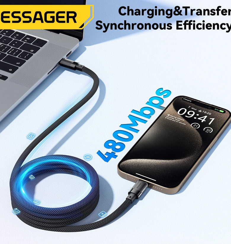 1. Premium Material: The ESSAGER ES-X53 cable is made from high-quality aluminum alloy, TPE, and 48-braid PP yarn for excellent durability and flexibility.