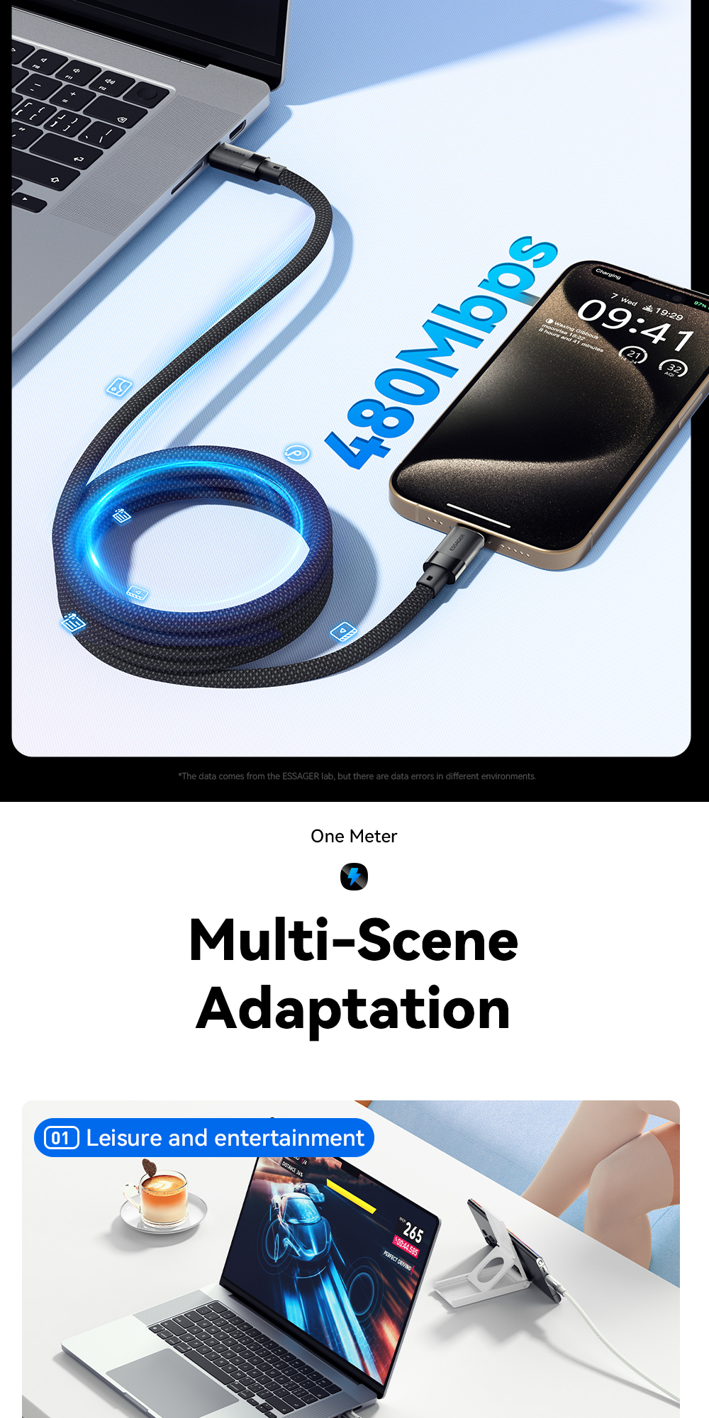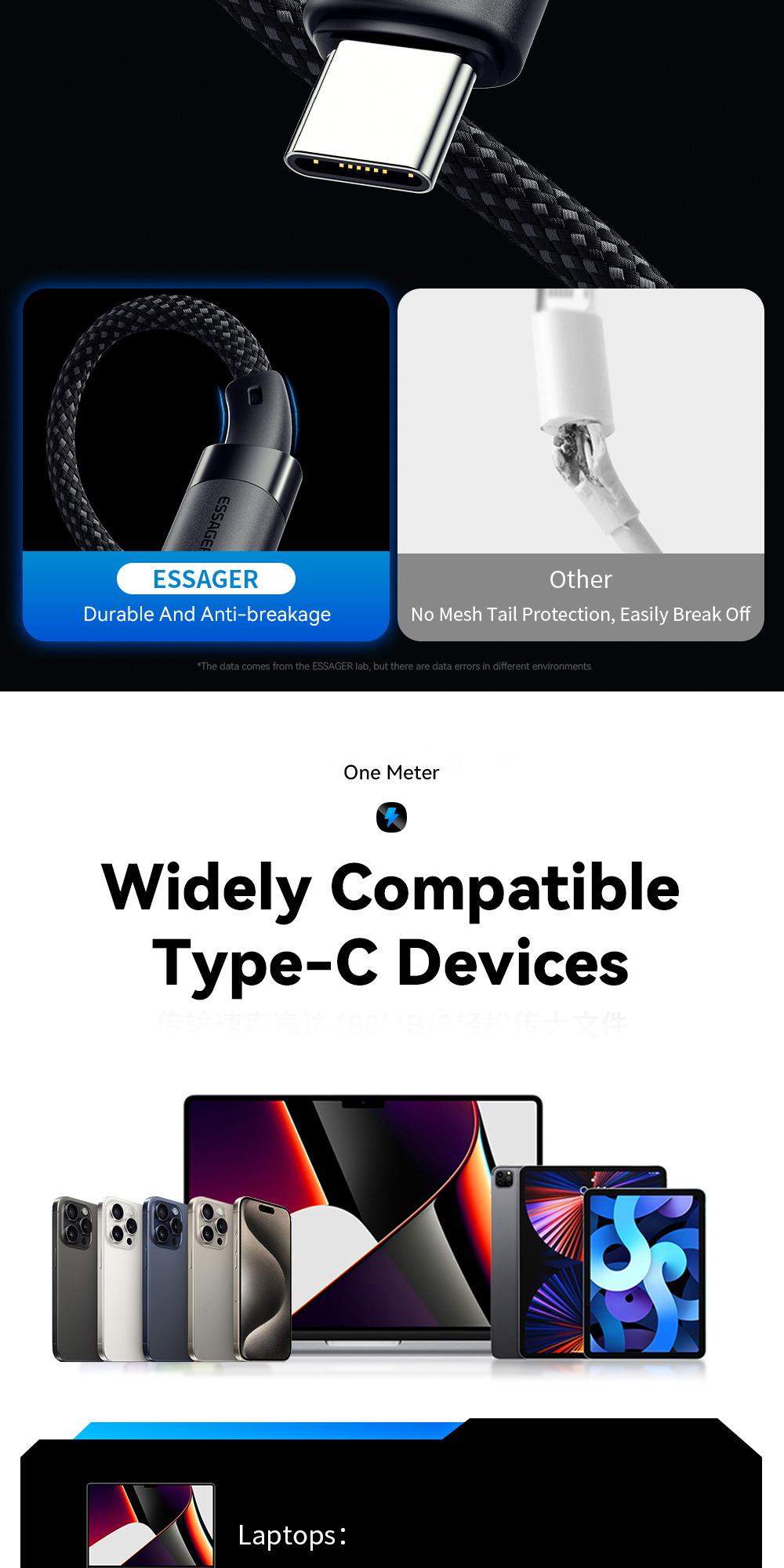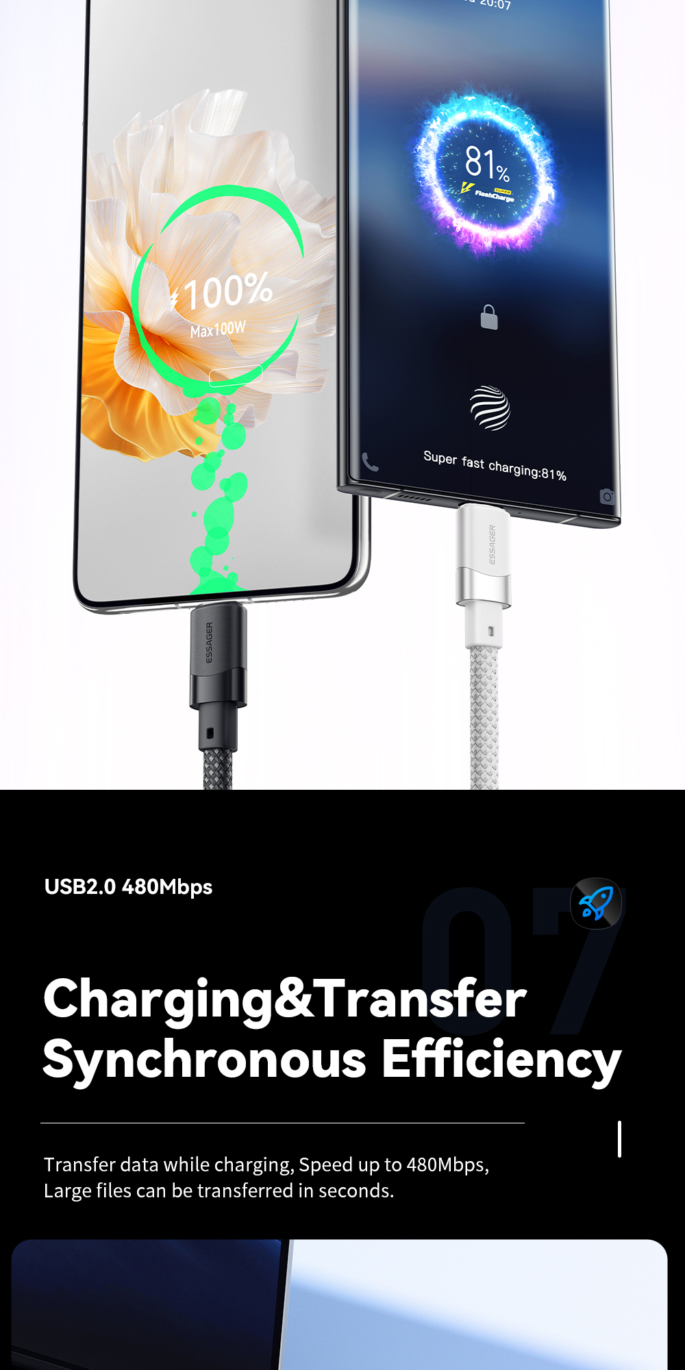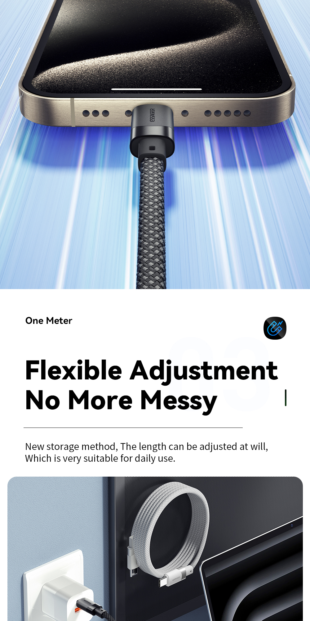 1. Premium Material: The ESSAGER ES-X53 cable is made from high-quality aluminum alloy, TPE, and 48-braid PP yarn for excellent durability and flexibility.