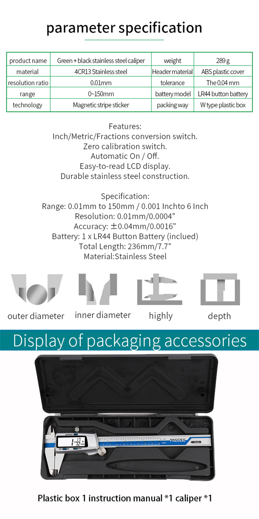 mso-bidi-font-family:'Times New Roman';font-size:10.5000pt;mso-font-kerning:1.0000pt;'>1. Versatile Measuring Tool: Equipped with a zero calibration switch, the stainless steel caliper provides precise measurements in Inch/Metric/Fractions, ranging from 0.01 mm to 150 mm or 0.001 Inch to 6 Inch.mso-bidi-font-family:'Times New Roman';font-size:10.5000pt;mso-font-kerning:1.0000pt;'>