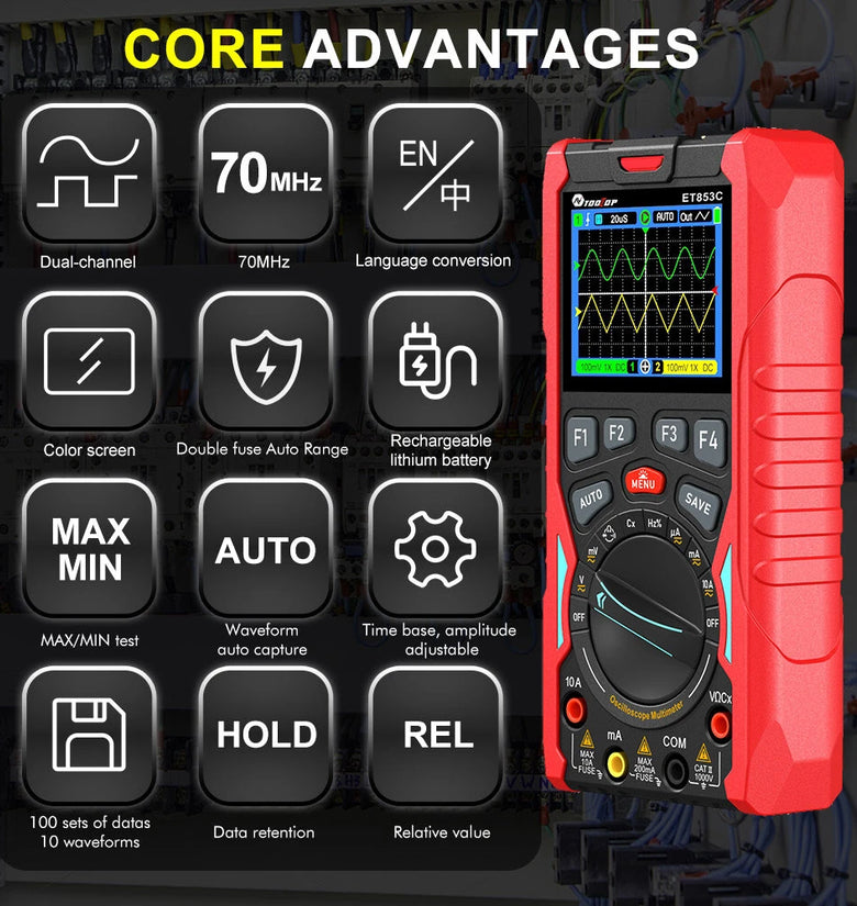 Modes: Dual-channel, MAX/MIN test, waveform auto capture