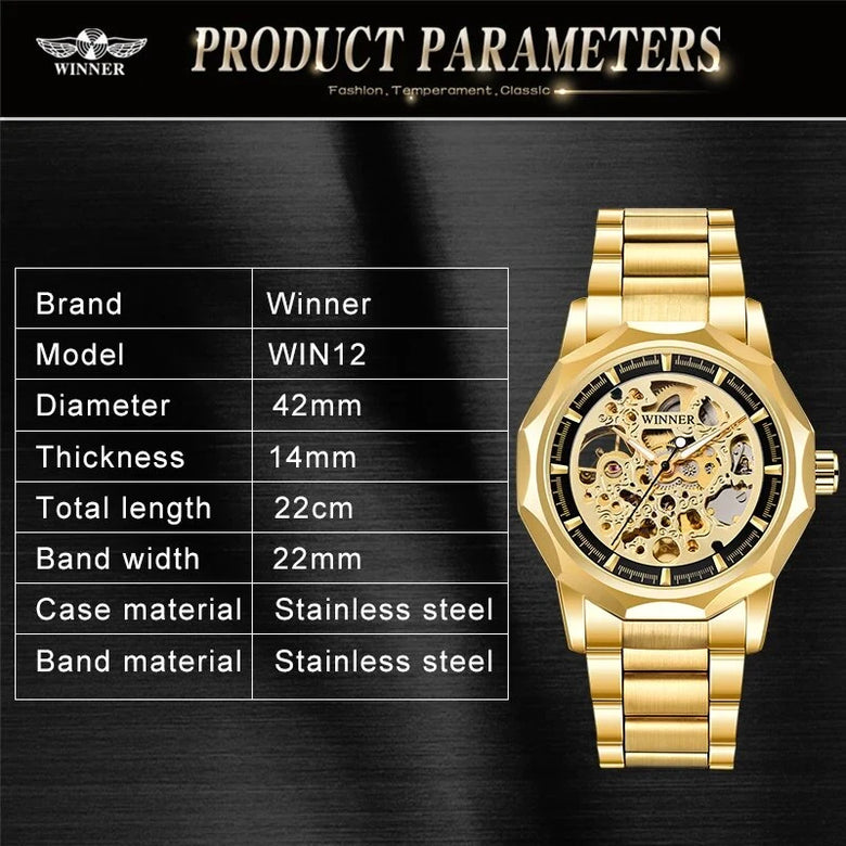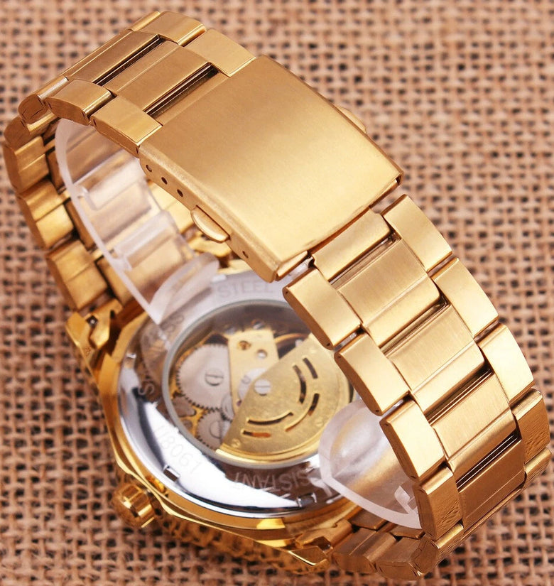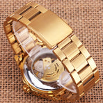 • Fashion Fully Auto Mechanical Skeleton Men Watch Retro Exquisite Dial Gold Steel Band Wristwatch
