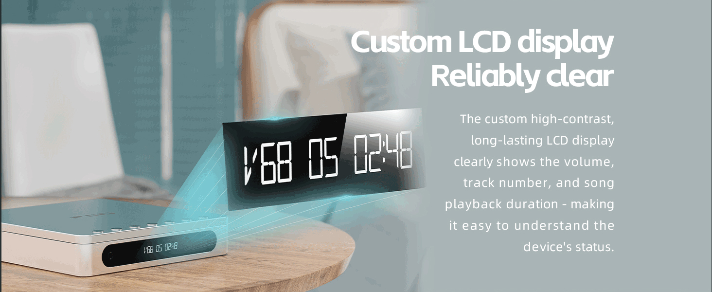 7. Custom LCD Display: Clear LCD screen displaying volume, track number, and playback duration, enhancing user experience.