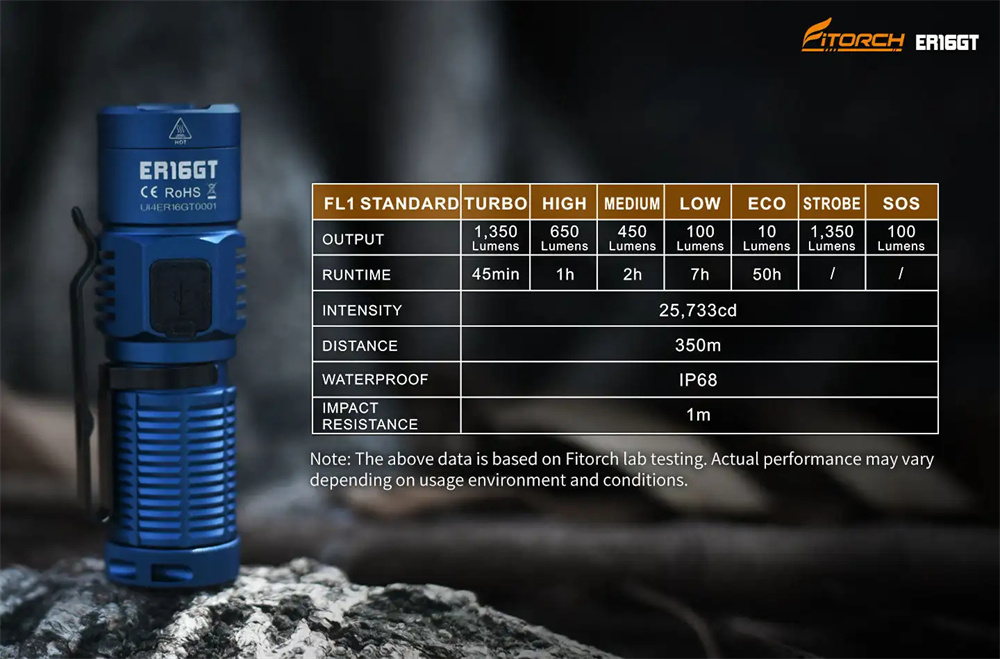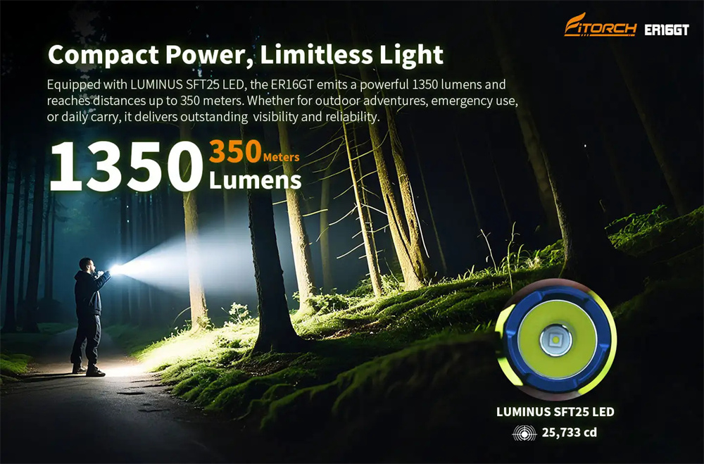 * 1350 lumens maximum output and 350 meters maximum beam distance.
