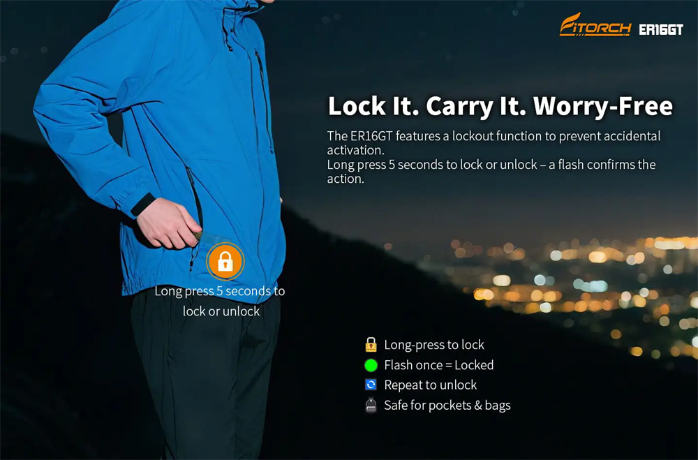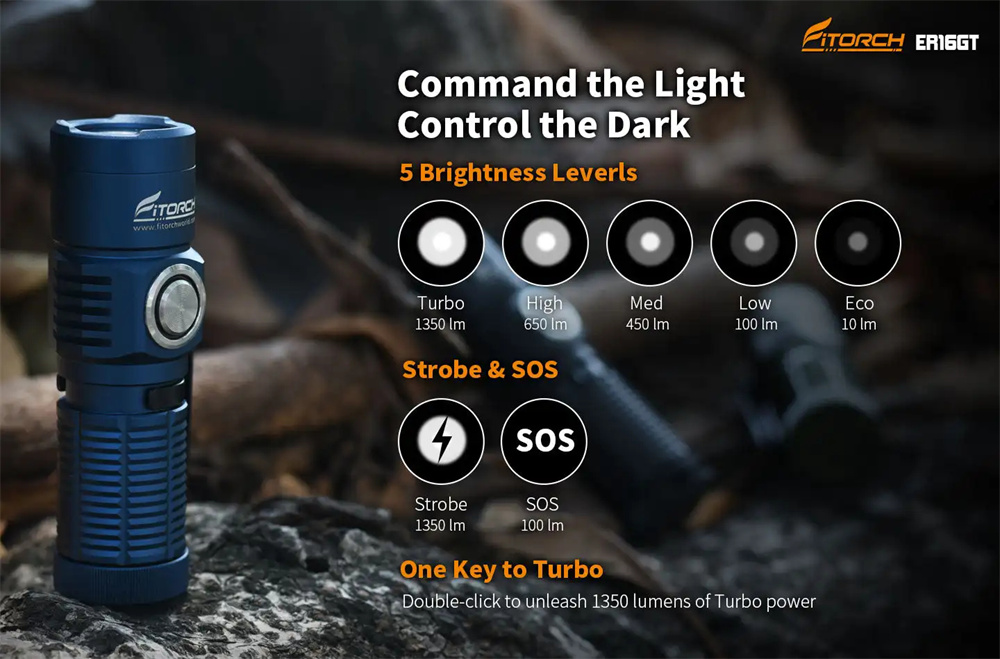 * 5 regular modes (Turbo–High–Mid–Low–Eco) and Strobe & SOS