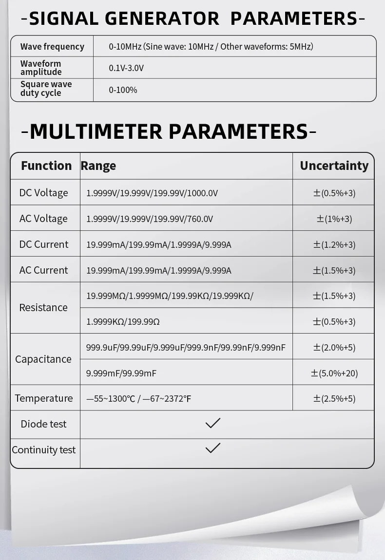 【Multimeter Functions】: Supports DCvoltage, ACvoltage, high current, low current, resistance measurement, capacitance measurement, temperature measurement, diode measurement, and on/off measurement functions, making it a useful tool for electronic engineering, maintenance debugging, and educational research.