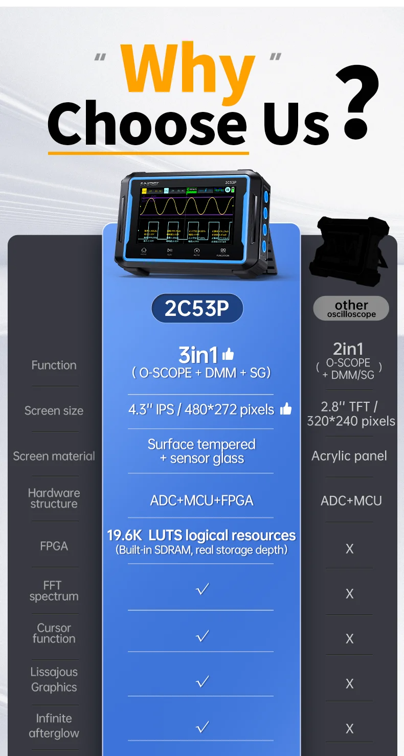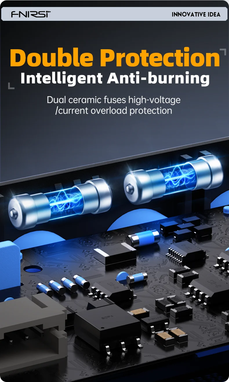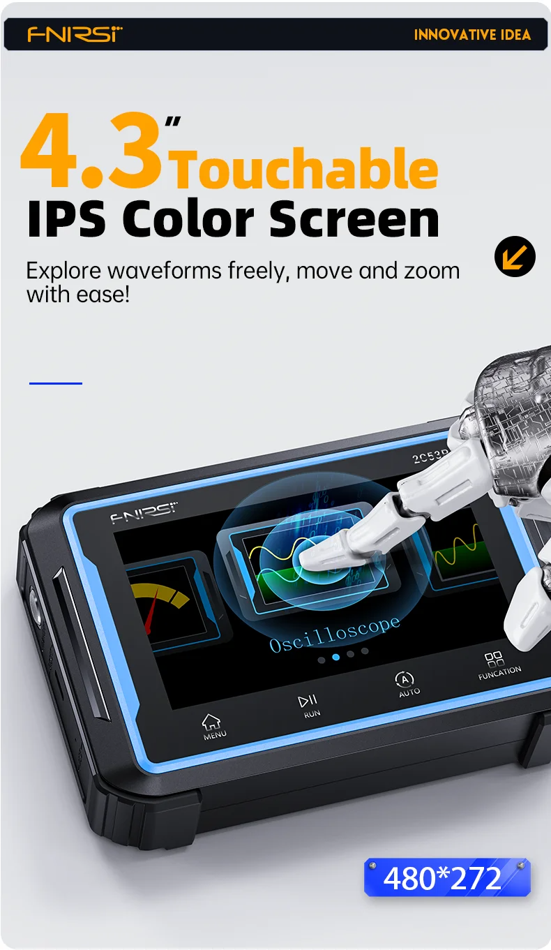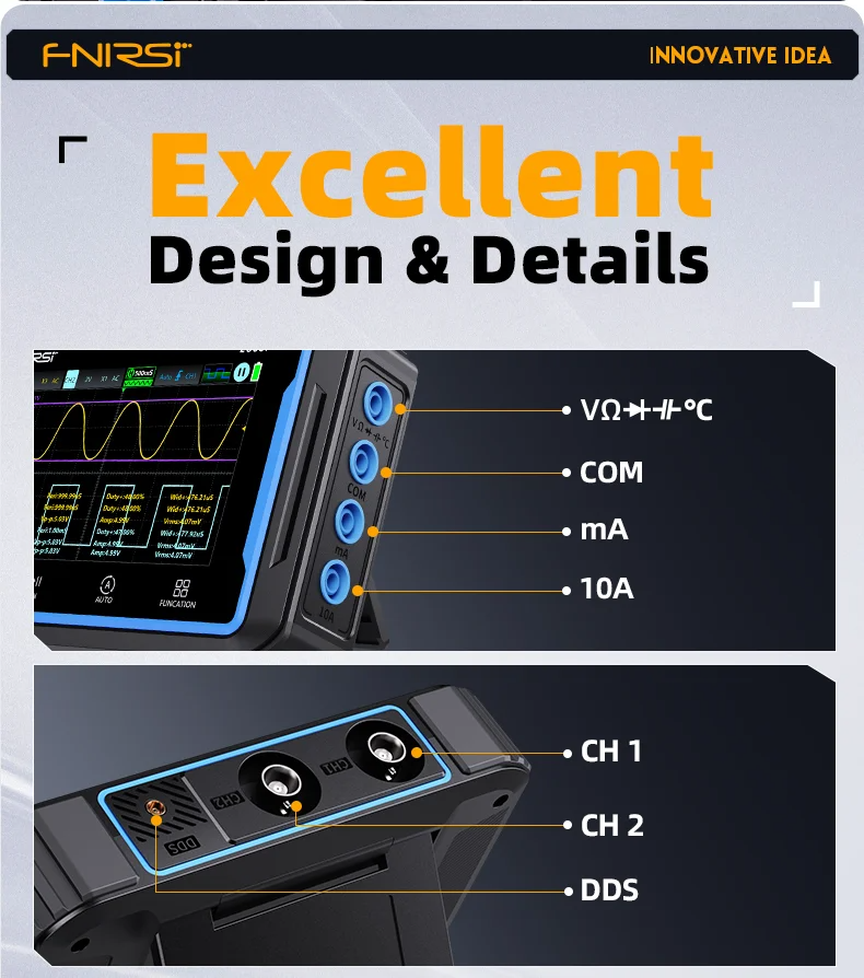 【Intelligent Burnproof Design】: The combination of FPGA+MCU+high-speed ADC architecture guarantees smooth and crisp waveform visualization. The G+G tempered glass screen and a shock-resistant silicone bezel makes the device is not only resistant to wear but also effortlessly portable, adapting seamlessly to various harsh environments. Enhanced with an intelligent burnproof feature and a dual fuse system, it ensures safer operation even in the event of misconfiguration, further enhancing user safety.