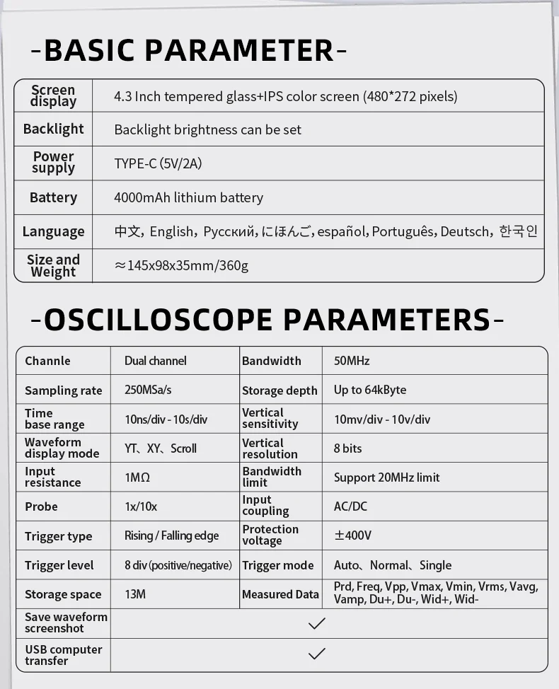 This product is an example of a combination of an oscilloscope, a signal generator, and an autorange multimeter. It can simultaneously measure a variety of electrical parameters or capture waveforms, and display the electrical parameters or waveforms of electrical signals. Multifunctional design, with auto-ranging, count true RMS measurement, data hold, and automatic shutdown functions. Supports voltage, resistance, capacitance, diode, current test. It can easily handle measurement in various fields, widely used in the fields of testing and debugging electronic circuits, troubleshooting and repairing electronics, communications, computers, etc.
