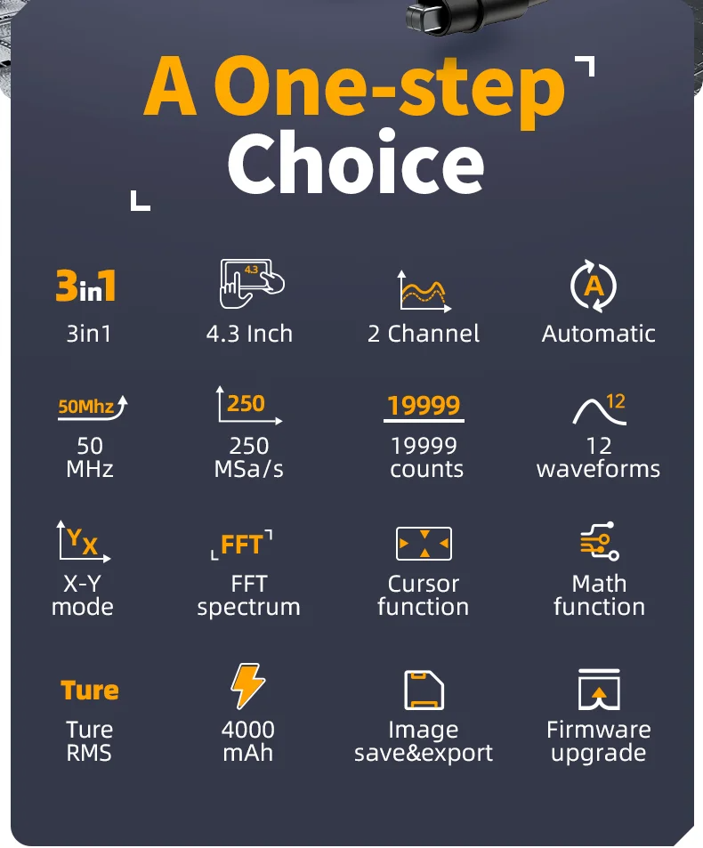 【3in1 Design & Comprehensive Measurement】: Integrates the 50MHz bandwidth oscilloscope, 4.5-digit high-precision multimeter, and 10M signal generator functions into one unit. It features a 4.3-inch IPS touchscreen, enabling multi-faceted and precise electronic signal detectionand analysis. This versatile design fulfills both professional testing requirements and the diverse needs of educational experimentation.