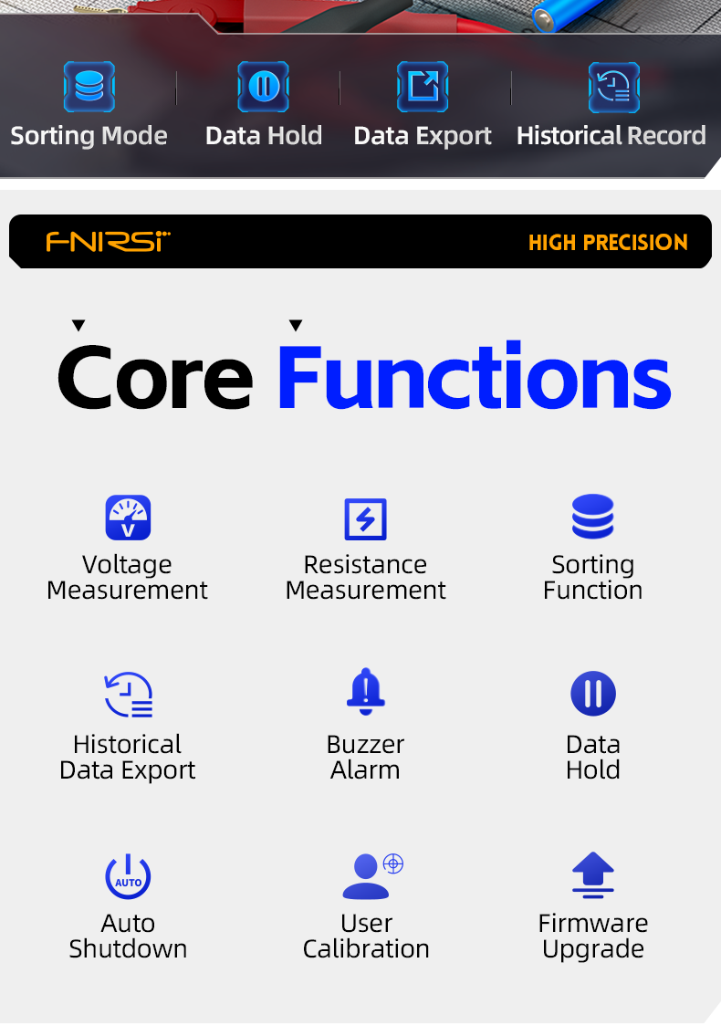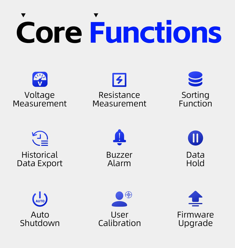 【Comprehensive Functionality】: The multifunctional design supports voltage measurement, resistance measurement, sorting, data storage, history data export, buzzer alarm, auto power off, user calibration, and firmware upgrade, simplifies battery assessment processes, and greatly improves work efficiency.