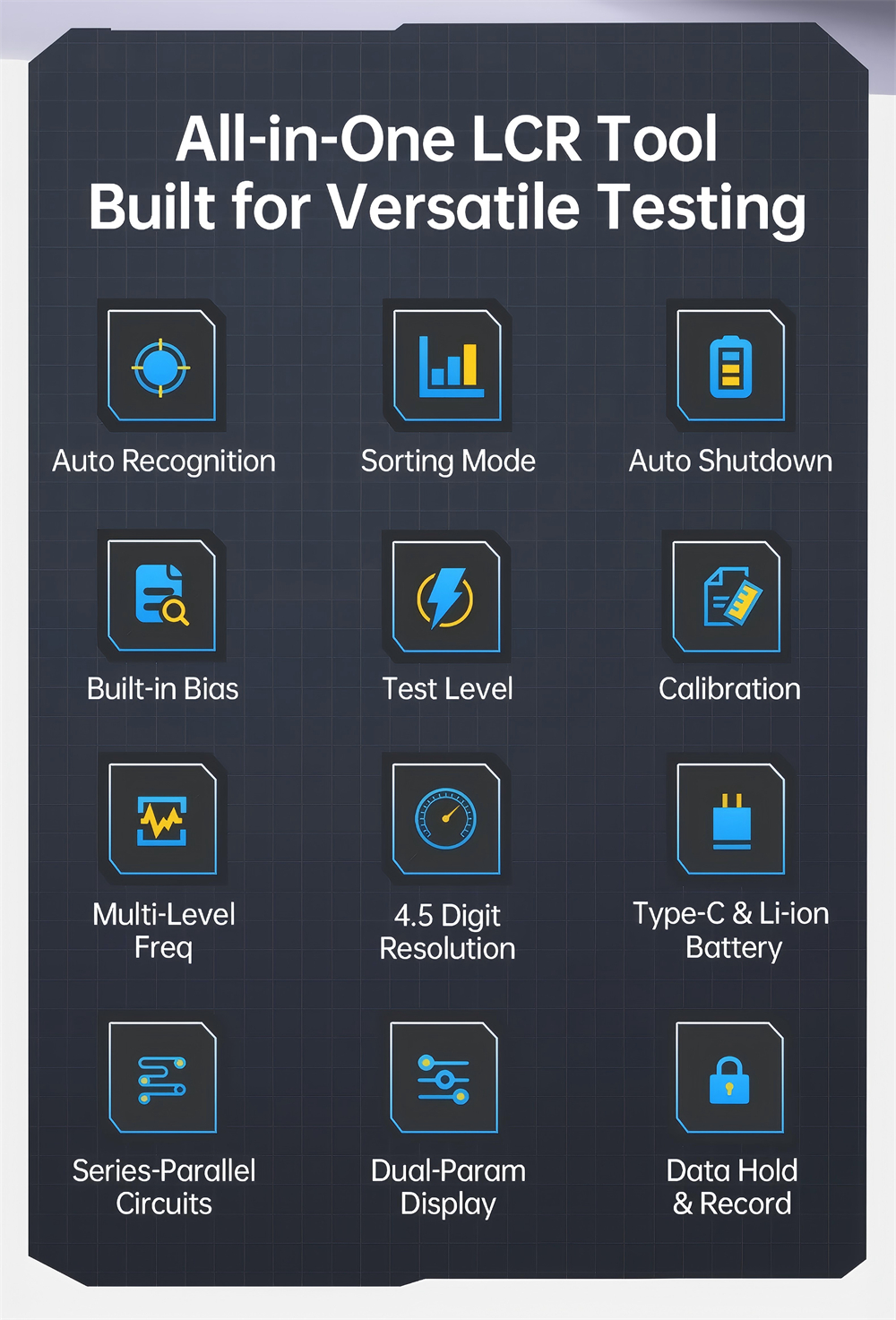 Supports various test modes including AUTO, R/C/L/Z and others, adapting to diverse component types while optimizing operational efficiency.