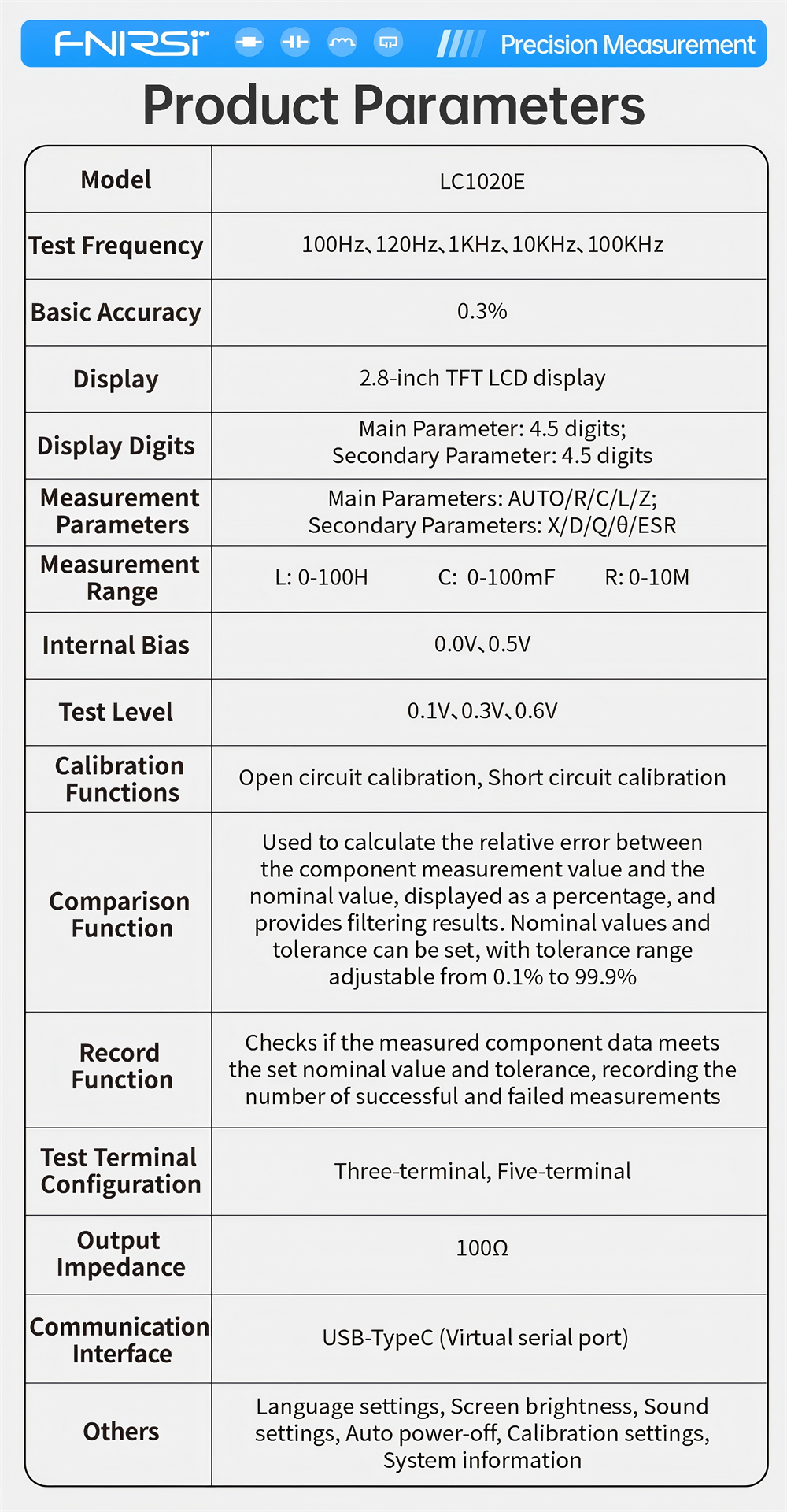 Test Frequency: 100Hz, 120Hz, 1kHz, 10kHz, 100kHz