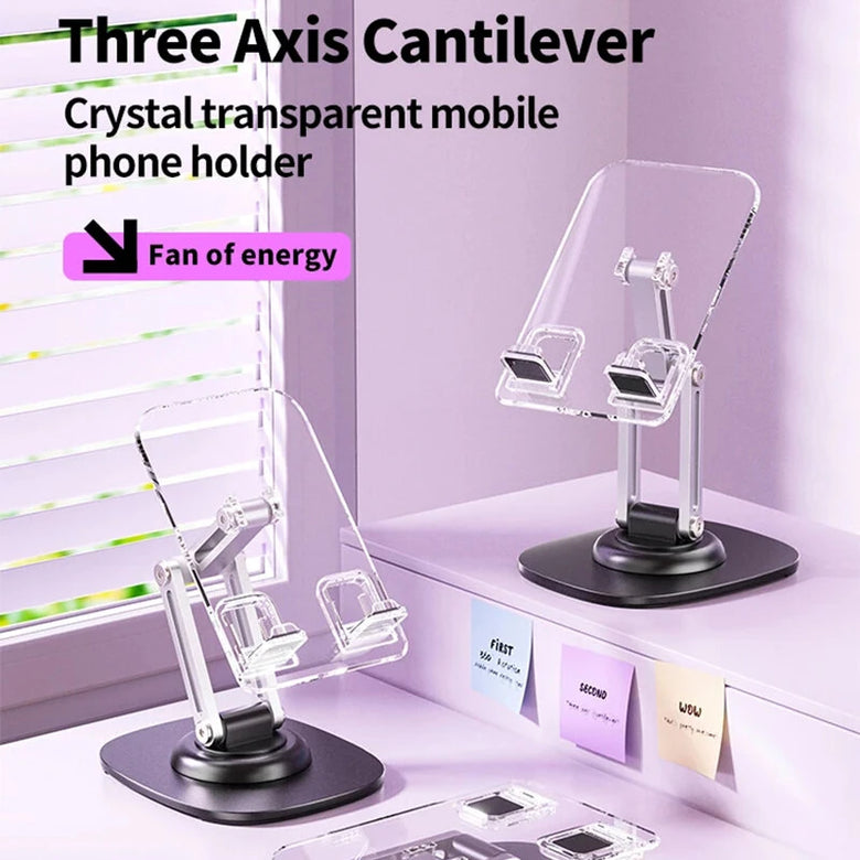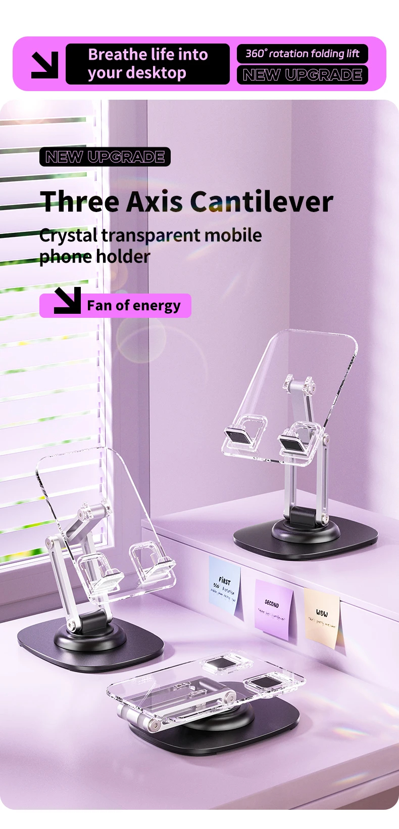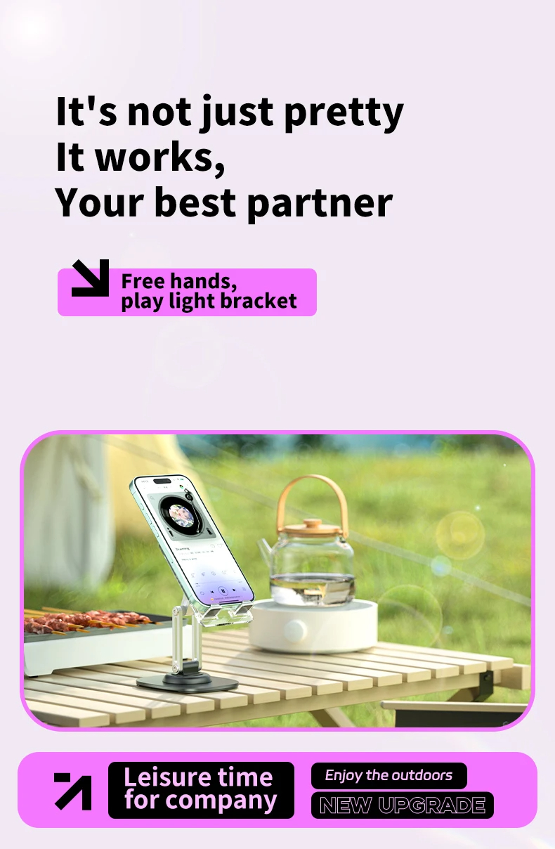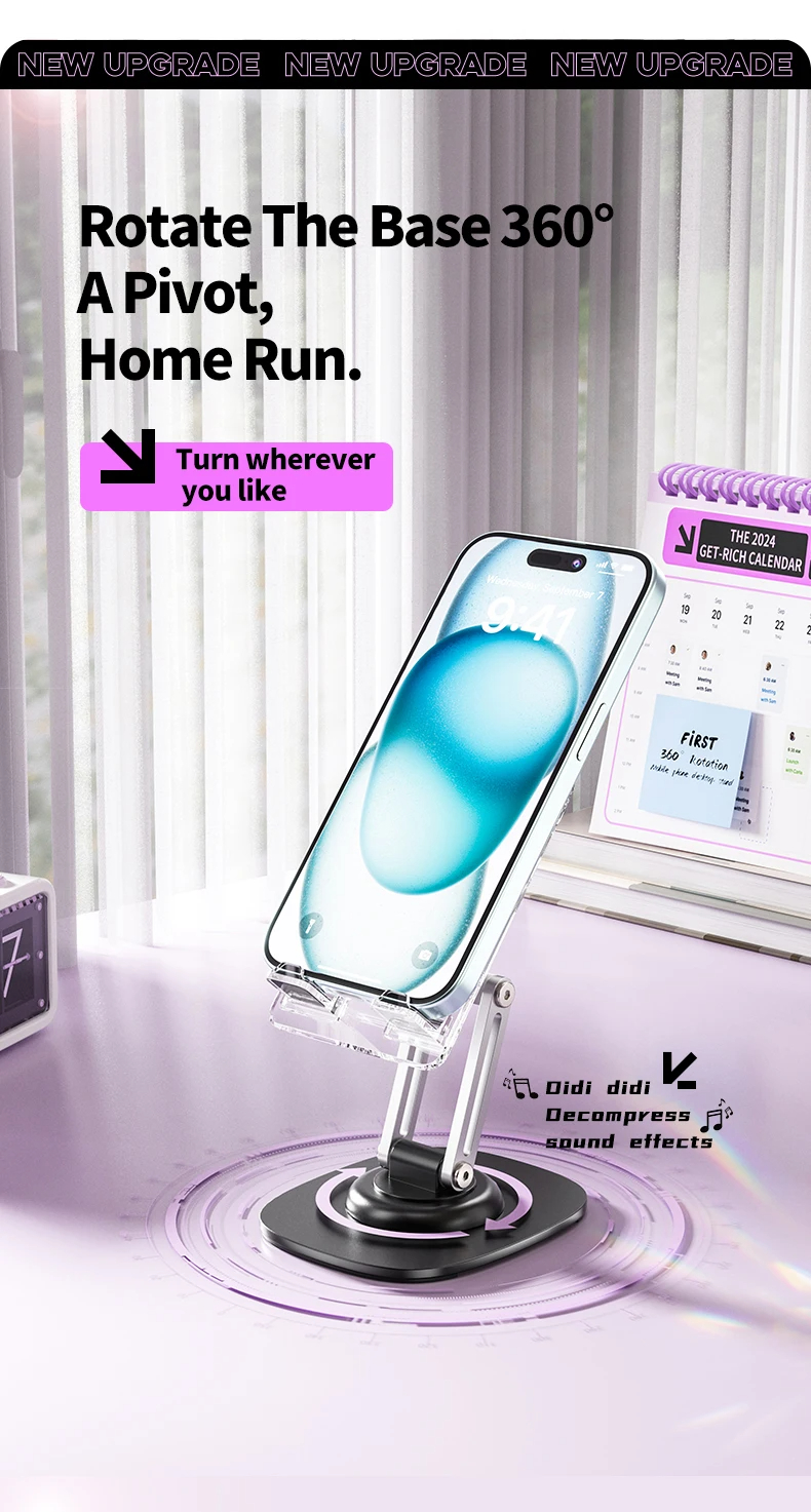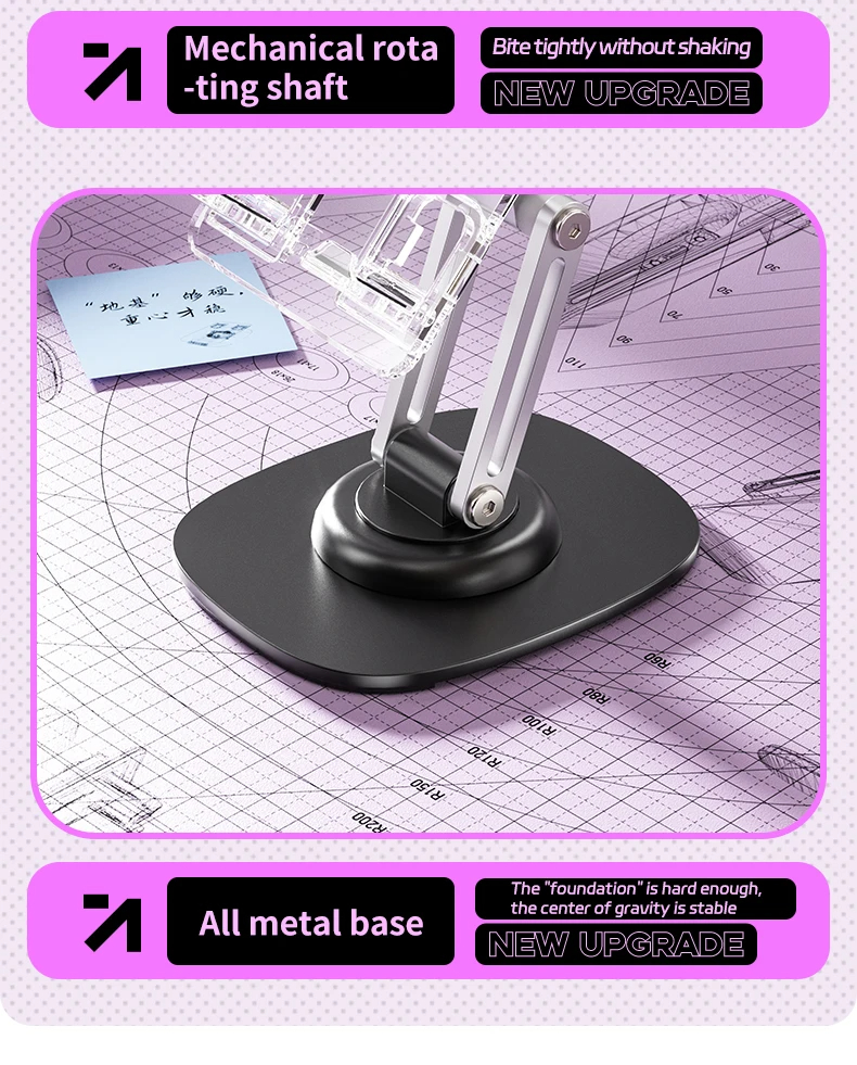 1. Metal desktop three-axis folding phone stand, 360° rotating metal chassis +AR ratchet rotating axis double linkage, bring silky rotation, with decompression sound effect.