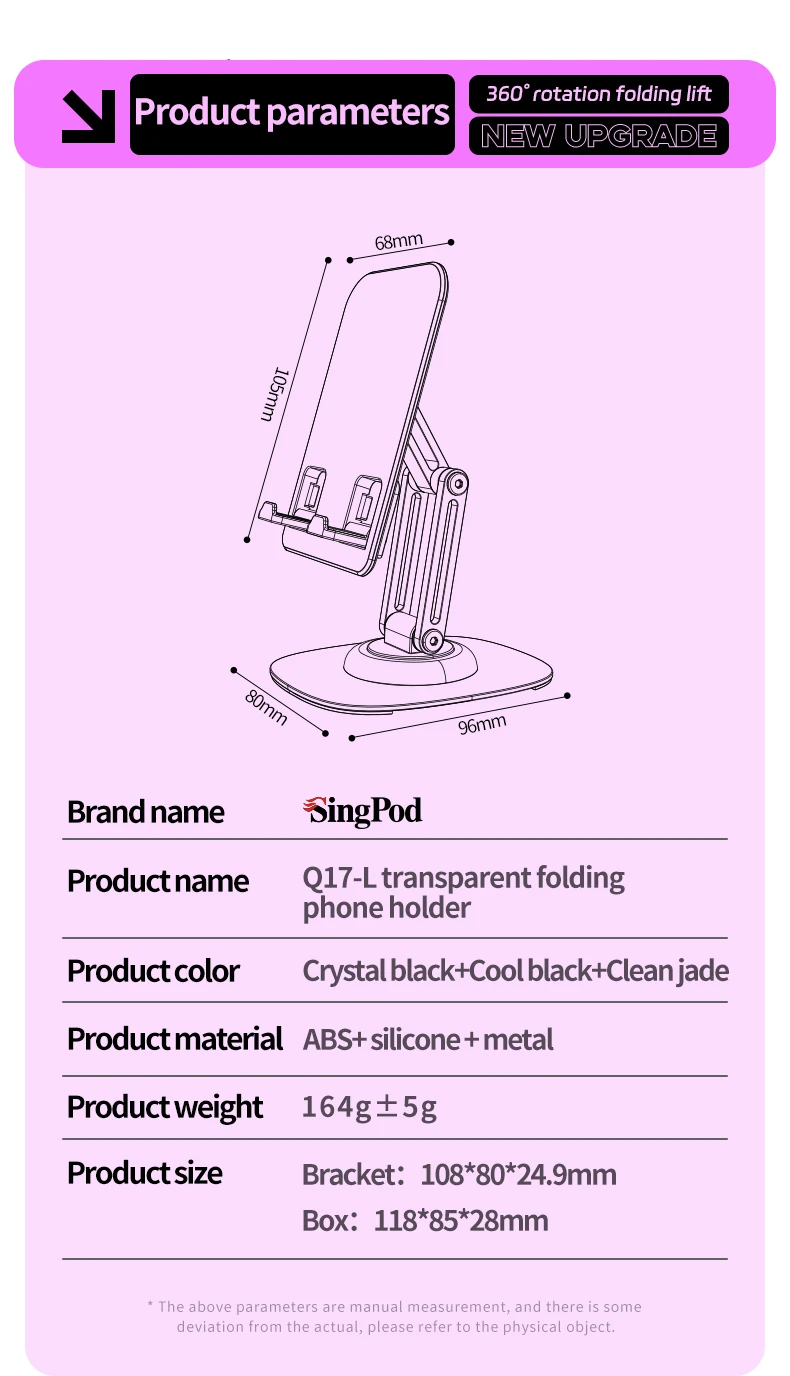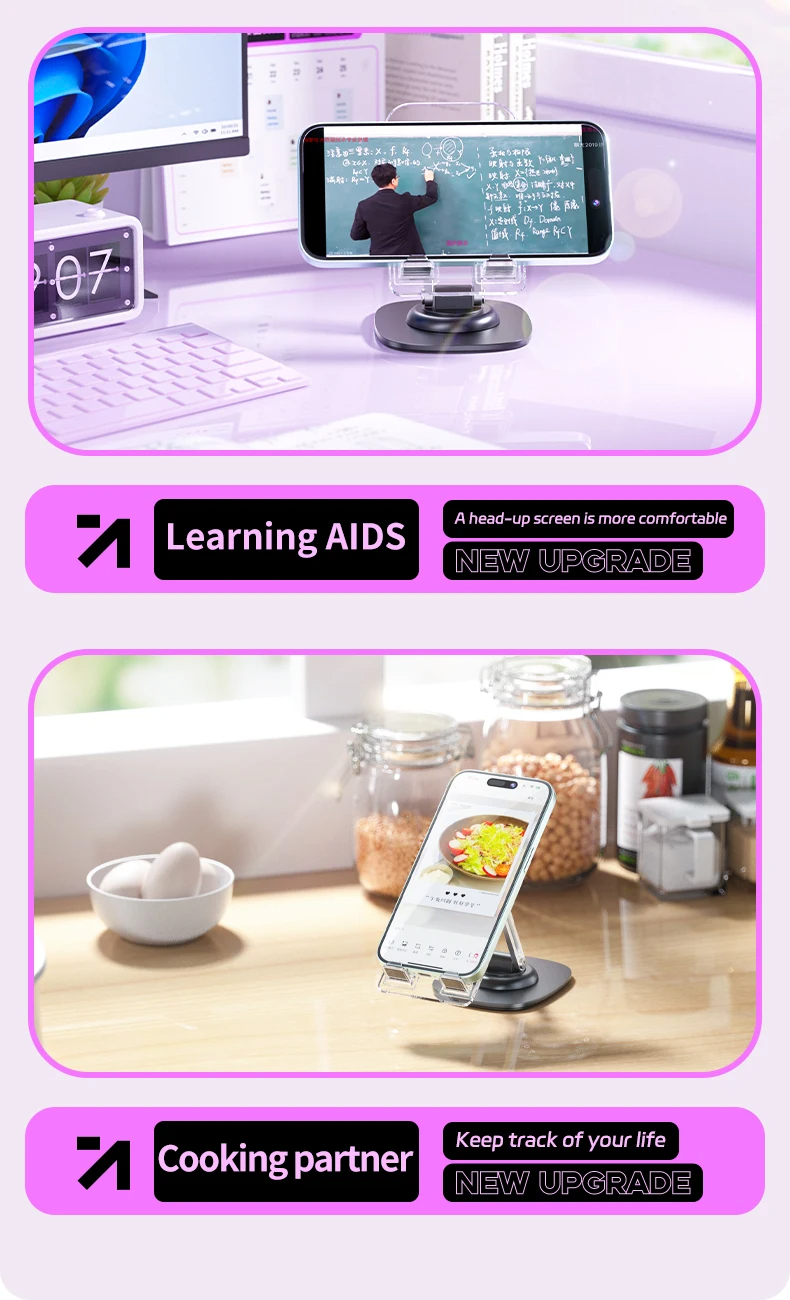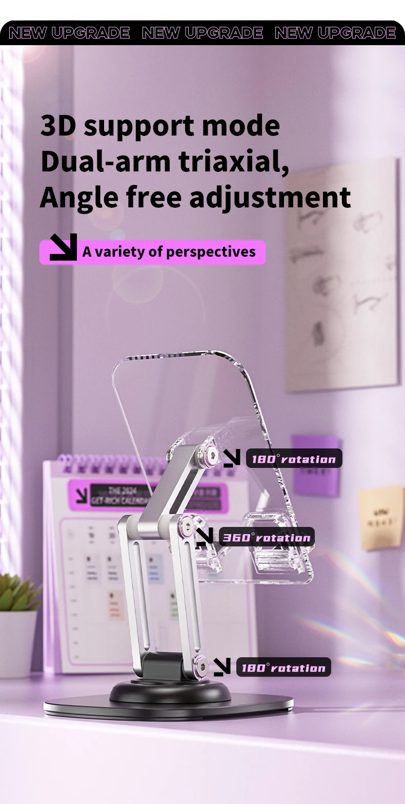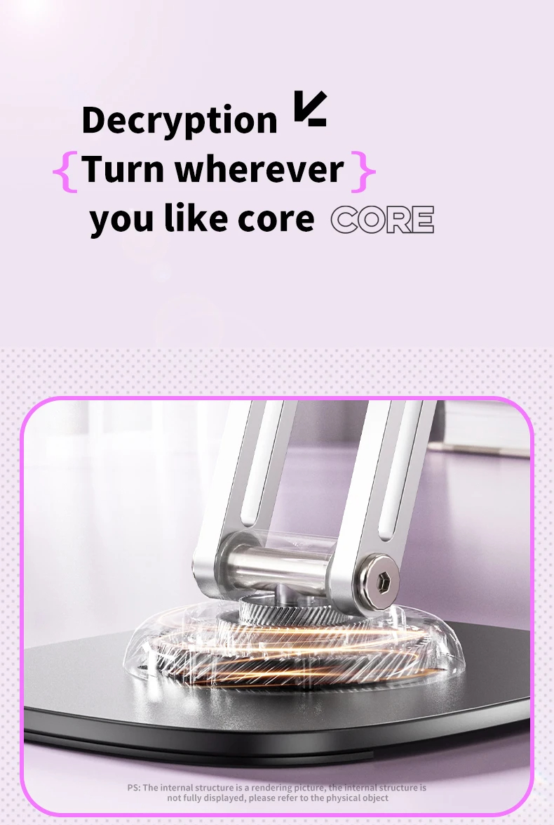 1. Metal desktop three-axis folding phone stand, 360° rotating metal chassis +AR ratchet rotating axis double linkage, bring silky rotation, with decompression sound effect.