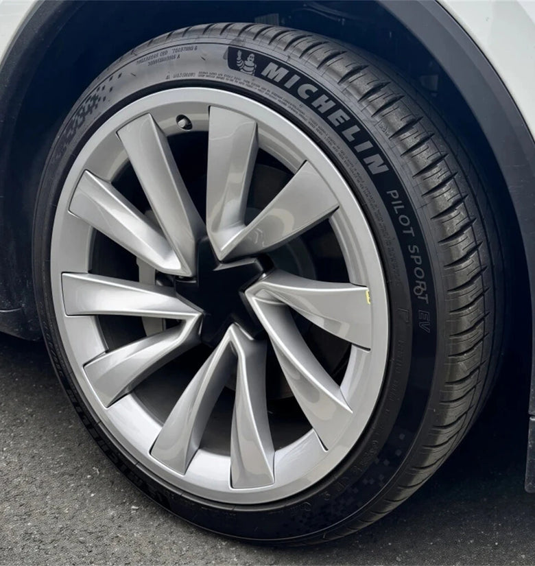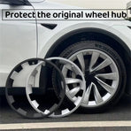 Model S Plaid with the same hubcap, fully surrounded design, so that the original car 18-inch wheels look bigger.
