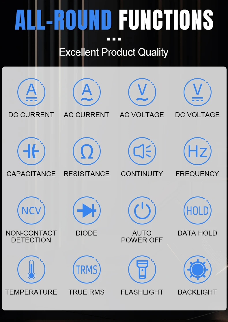 Provides precise readings for AC/DC current, voltage, resistance, and temperature, accommodating a broad range of electrical diagnostic needs with accuracy.