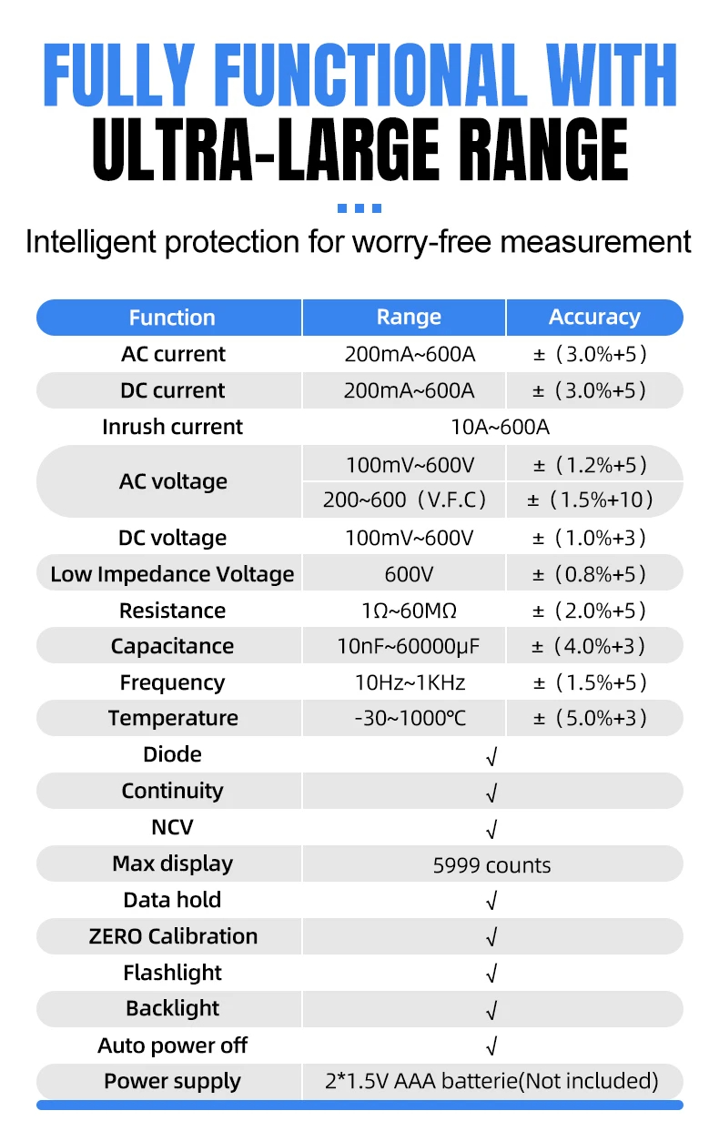 AC Voltage: 100mV–600V ± (1.2%+5)