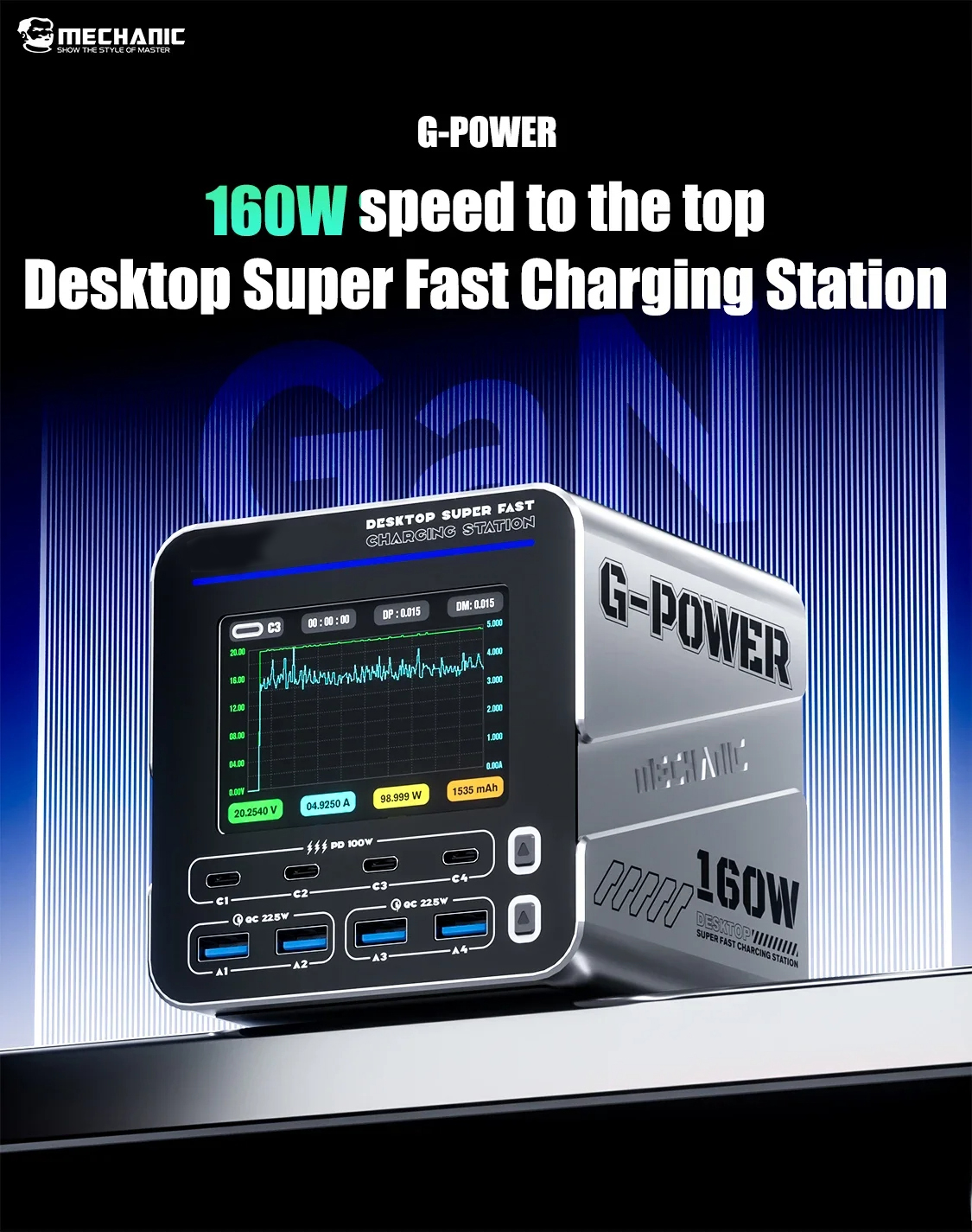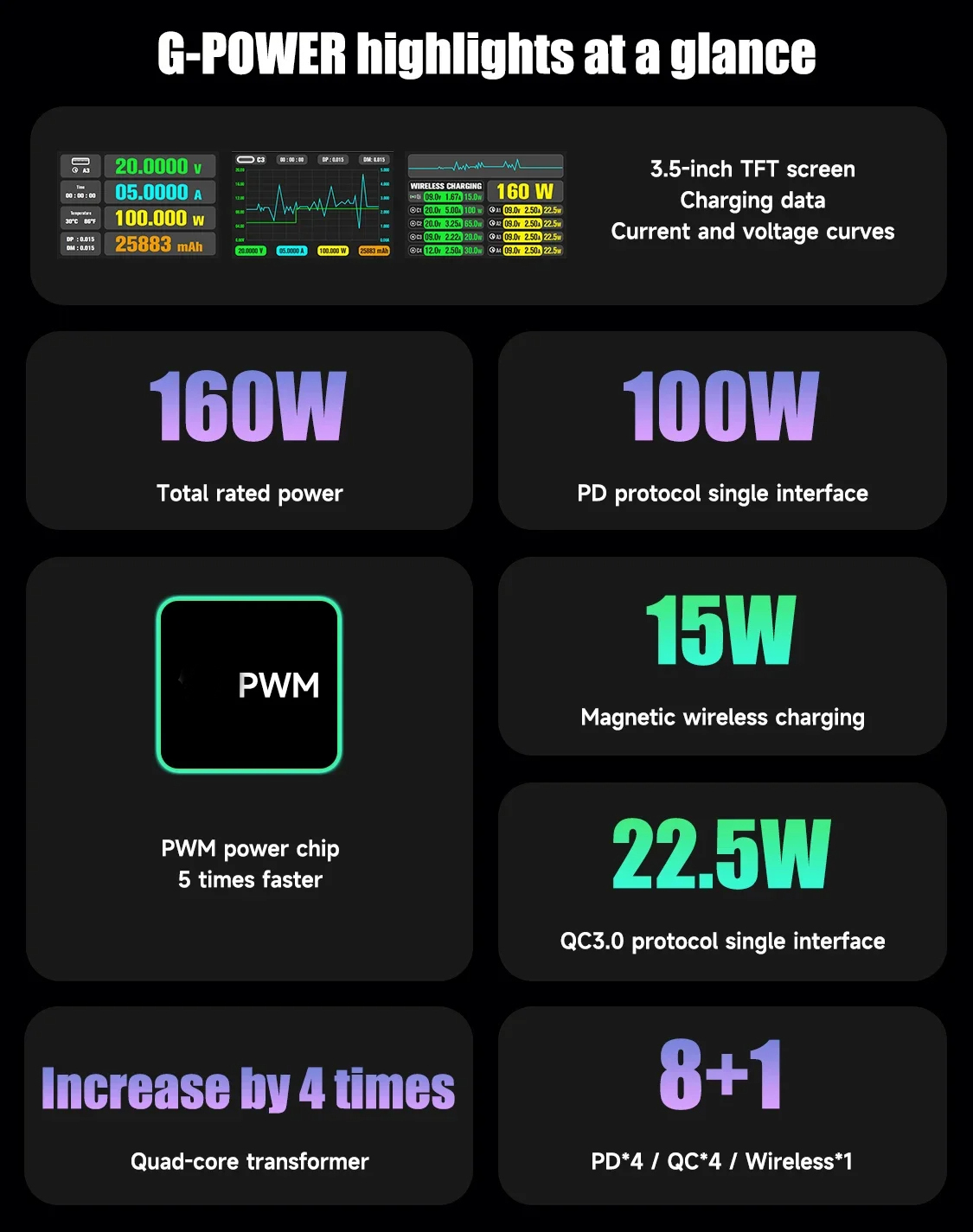 • G-POWER 160W Nitride Charger GaN Fast Charger 8-Port PD3.1 QC USB-C USB-A Charging Station with 15W Wireless Charge Metal Body