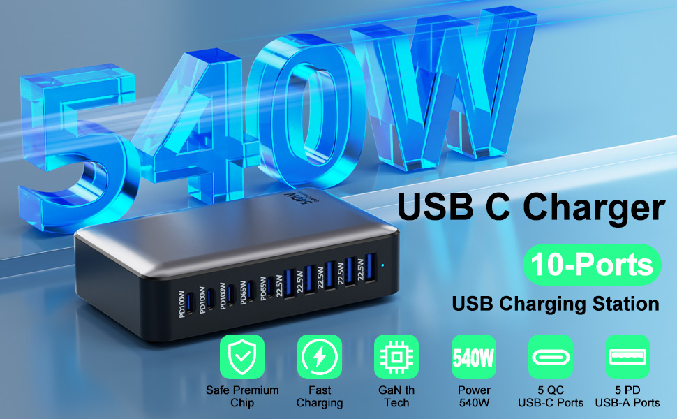 1. 10-in-1 Charging Station: Capable of simultaneously charging up to 10 devices including smartphones, laptops, tablets, and other accessories.