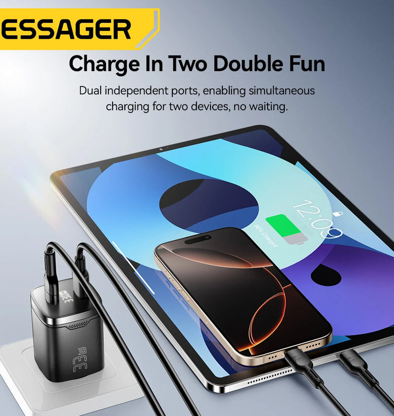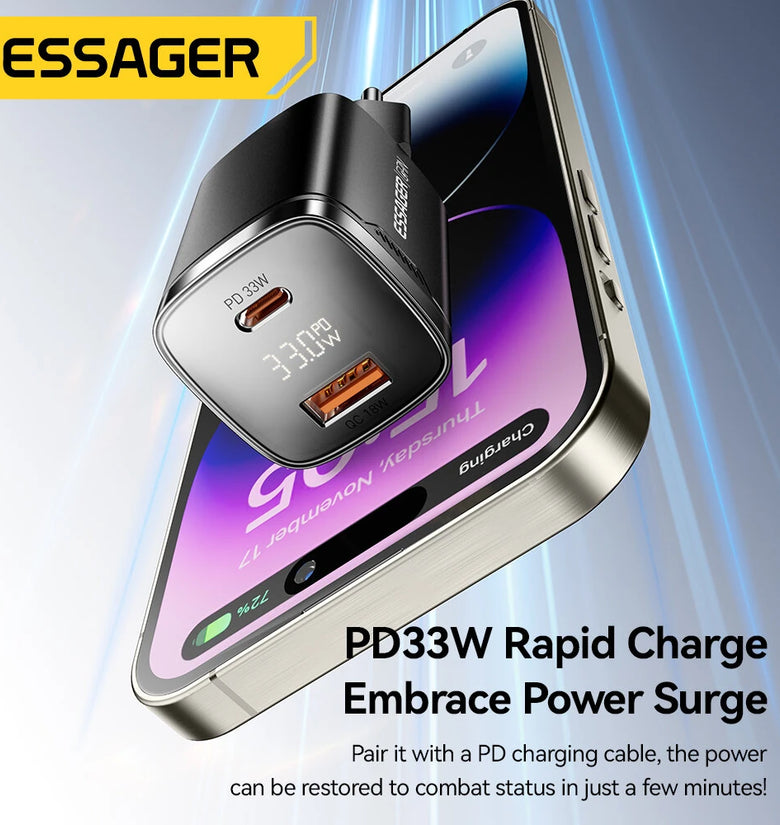 • [GaN Tech] ESSAGER ES-CD45 PD33W 2-Port USB PD Charger USB-A+USB-C PD3.0 QC4.0 AFC FCP PPS iP2.4A Fast Charging Digital Display Wall Charger Adapter EU Plug for iPhone 16 16 Pro 15 14 13 Pro Max for Xiaomi 15pro for Samsung Galaxy Z Flip6
