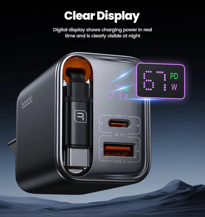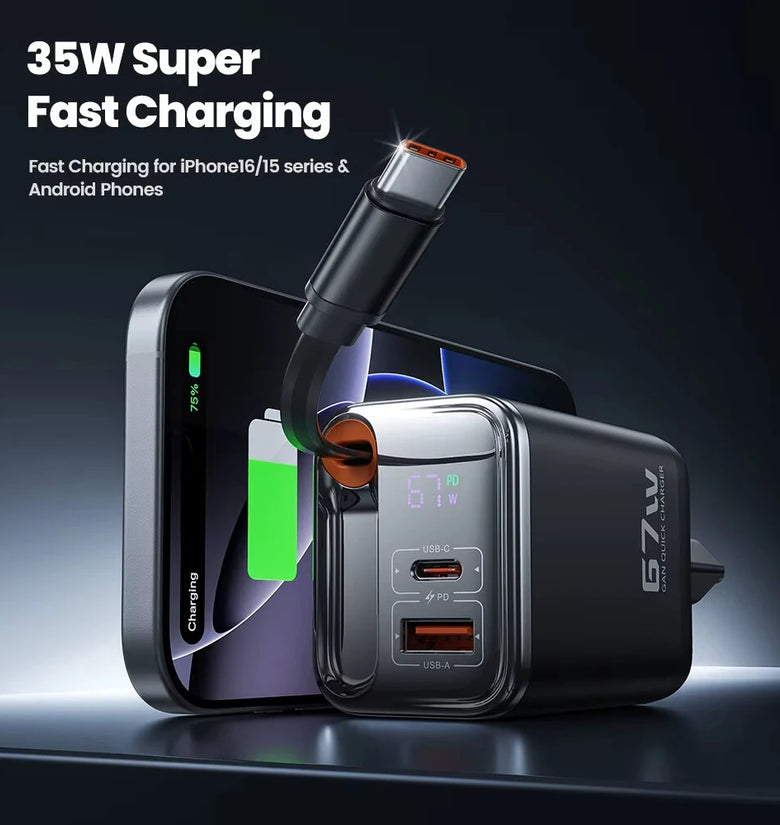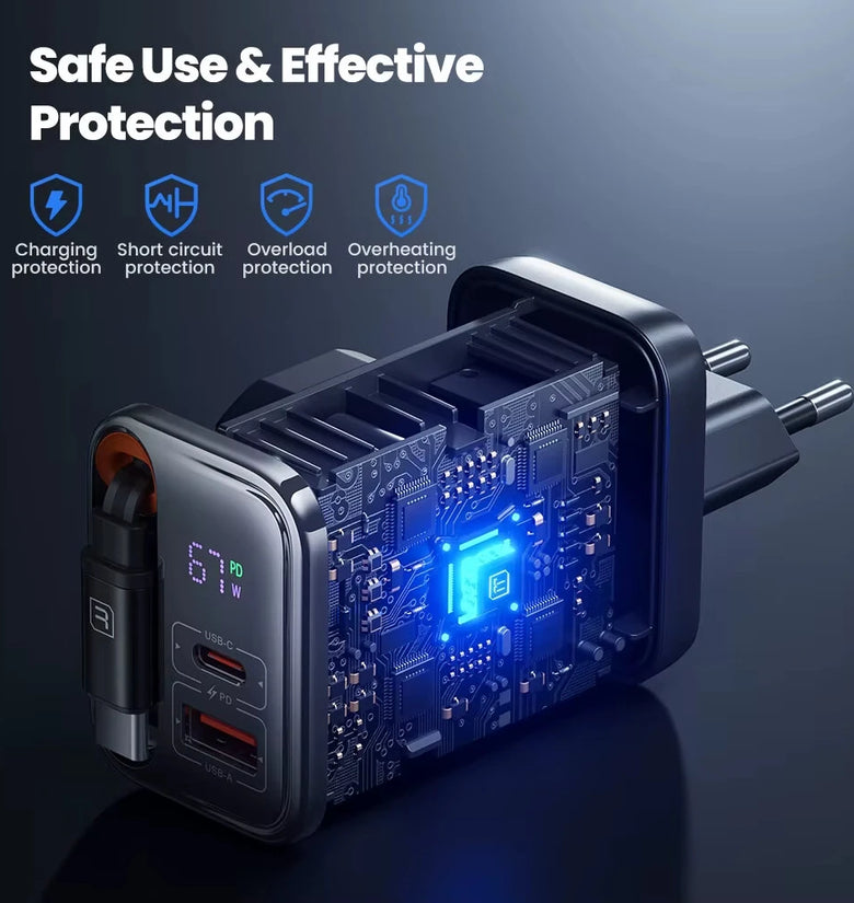 | Output | USB-C Output: 5.0V-3.0A(15.0W),9.0V-3.0A(27.0W), 12.0V=3.0A(36.0W),15.0V-3.0A(45.0W), 20.0V-3.35A (67.0W Max.) USB-C Cable Output: 5.0V-3.0A(15.0W),9.0V-3.0A(27.0w),12.0V-3.0A(36.0W),15.0V-3.0A(45.0w),20.0V-3.0A (60.0W Max.) USB-A Output: 5.0V-3.0A(15.0W),9.0V-3.0A(27.0w),12.0V-2.5A(30.0W),20.0Vm1.5A(30.0W Max.) USB-A+USB-C Output: 5.0V-3.0A(15.0W Max.) USB-C Cable+USB-A Output: 45.0W+18.0W(63.0W Max.) USB-C Cable+USB-C Output: 45.0W+20.0W(65.0W Max.) USB-C Cable+(USB-C+USB-A) Output: 45.0W+15.0W(60.0W Max) Total Output: 67.0W |