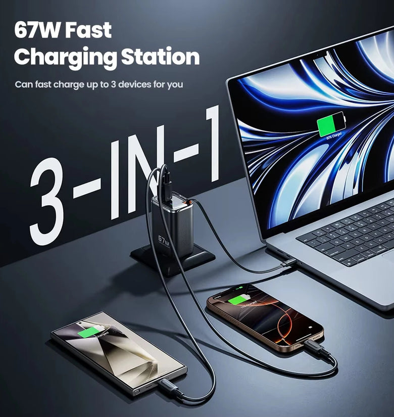 1. Multi-Port Charging: 3-in-1 functionality supports simultaneous charging for multiple devices, including laptops, smartphones, and tablets.Package Include: