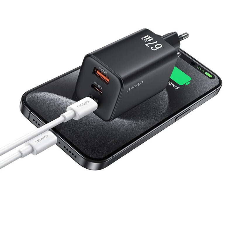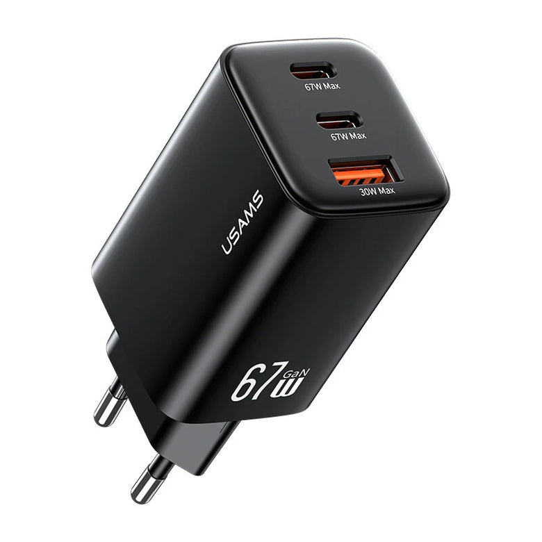 • [GaN Tech] USAMS CC265 67W 3-Port USB Charger 2USB-C+USB-A Fast Charging Wall Charger Adapter EU Plug for iPhone 16 16 Pro 15 14 13 Pro Max for Xiaomi 15pro for Samsung Galaxy S25 Ultra