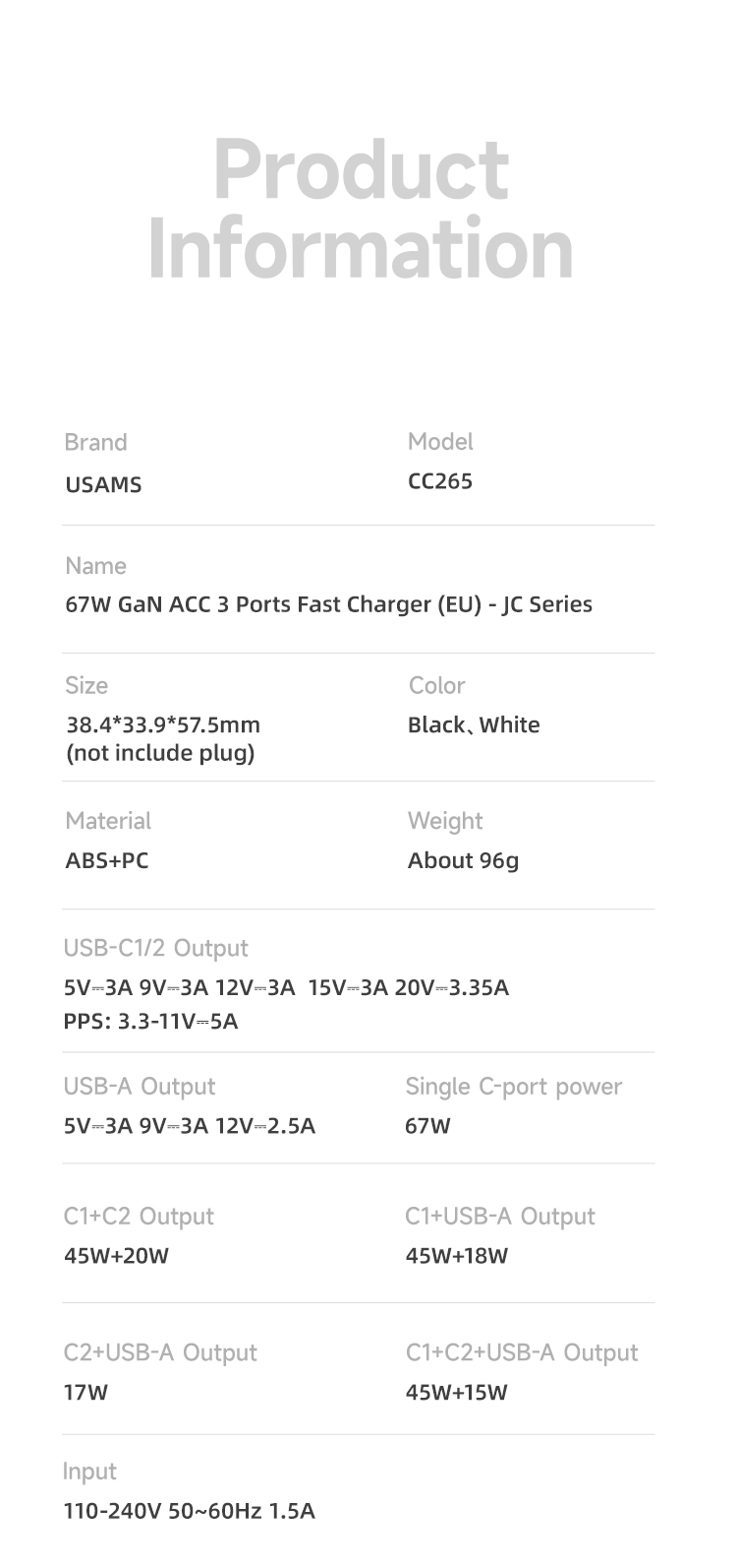 | Output | USB-C1/2: 5V/3A, 9V/3A, 12V/3A, 15V/3A, 20V/3.35A PPS: 3.3-11V/5A USB-A: 5V/3A, 9V/3A, 12V/2.5A Single C-Port: 67W C1+C2: 45W+20W C1+USB-A: 45W+18W C2+USB-A: 17W C1+C2+USB-A: 45W+15W |