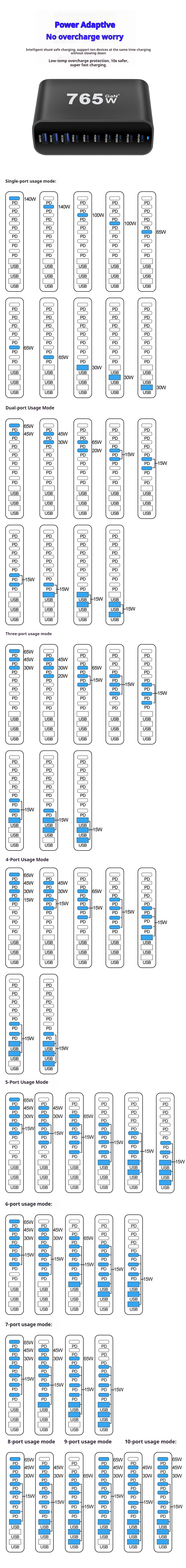| Output | USB-C1/C2:5V3A/9V3A/12V3A/15V3A/20V5A/28V5A 140W(Max) USB-C3/C4:5V3A/9V3A/12V3A/15V3A/20V5A 100W(Max) USB-C5/C6/C7:5V3A/9V3A/12V3A/15V3A/20V3.25A 65W(Max) USB-A1/A2/A3:5V3A/9V3A/12V2.5A/20V1.5A 30W(Max) |