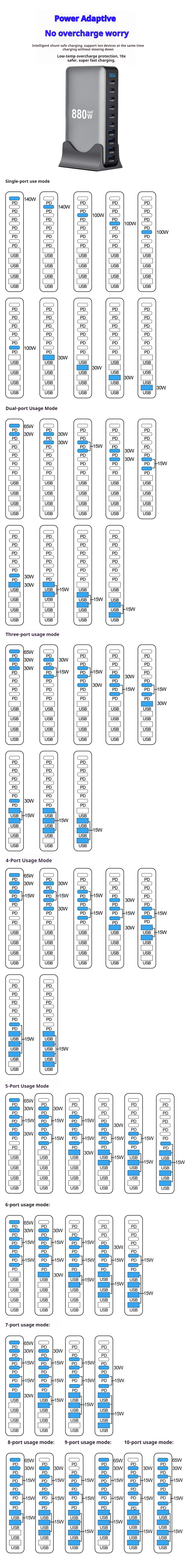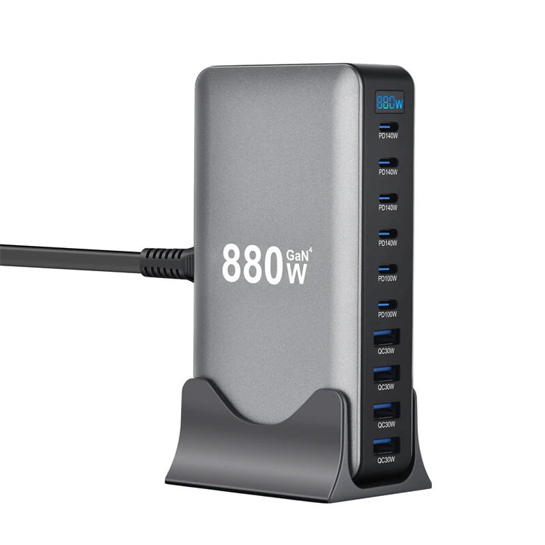 1. High Power Output: Offers a total output of up to 880W, supporting multiple devices simultaneously without compromising on charging speed.